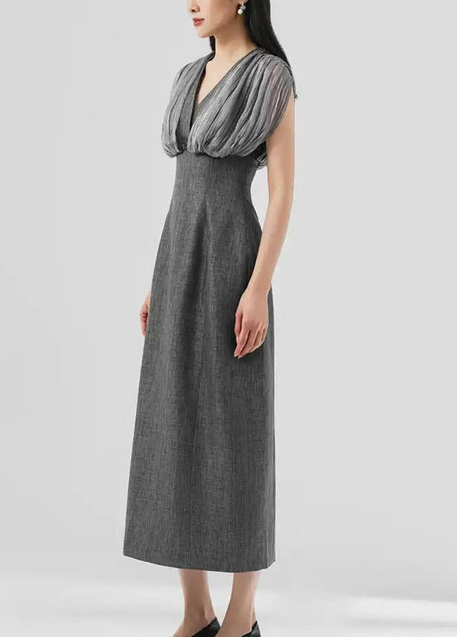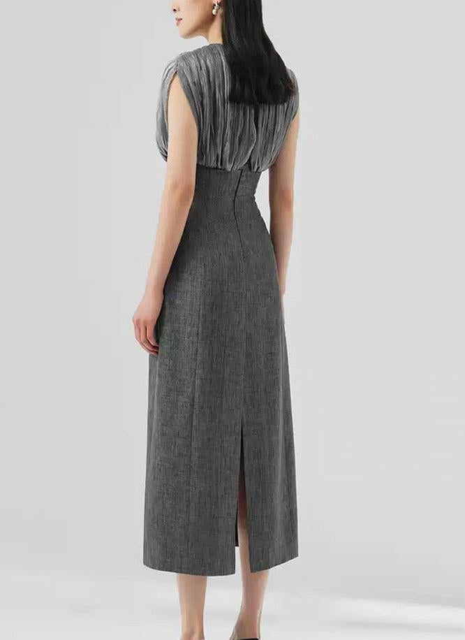 This sleeveless maxi dress features intricate mesh stitching in a sophisticated grey tone, combining elegance with breathable comfort. Its flowing silhouette offers a flattering fit suitable for various occasions, while the mesh detailing adds a modern, textured dimension to the design. Ideal for those seeking a refined yet contemporary look.