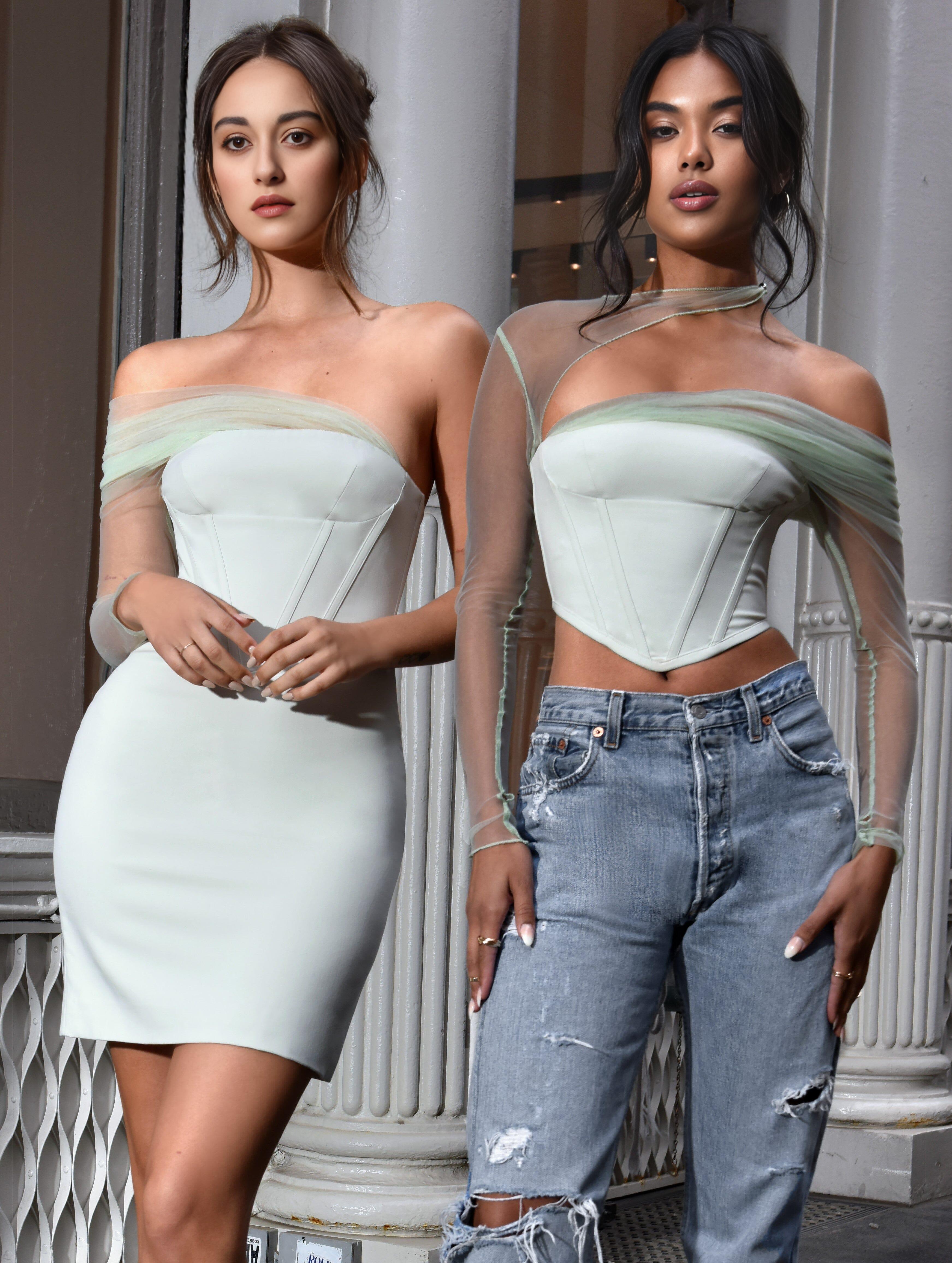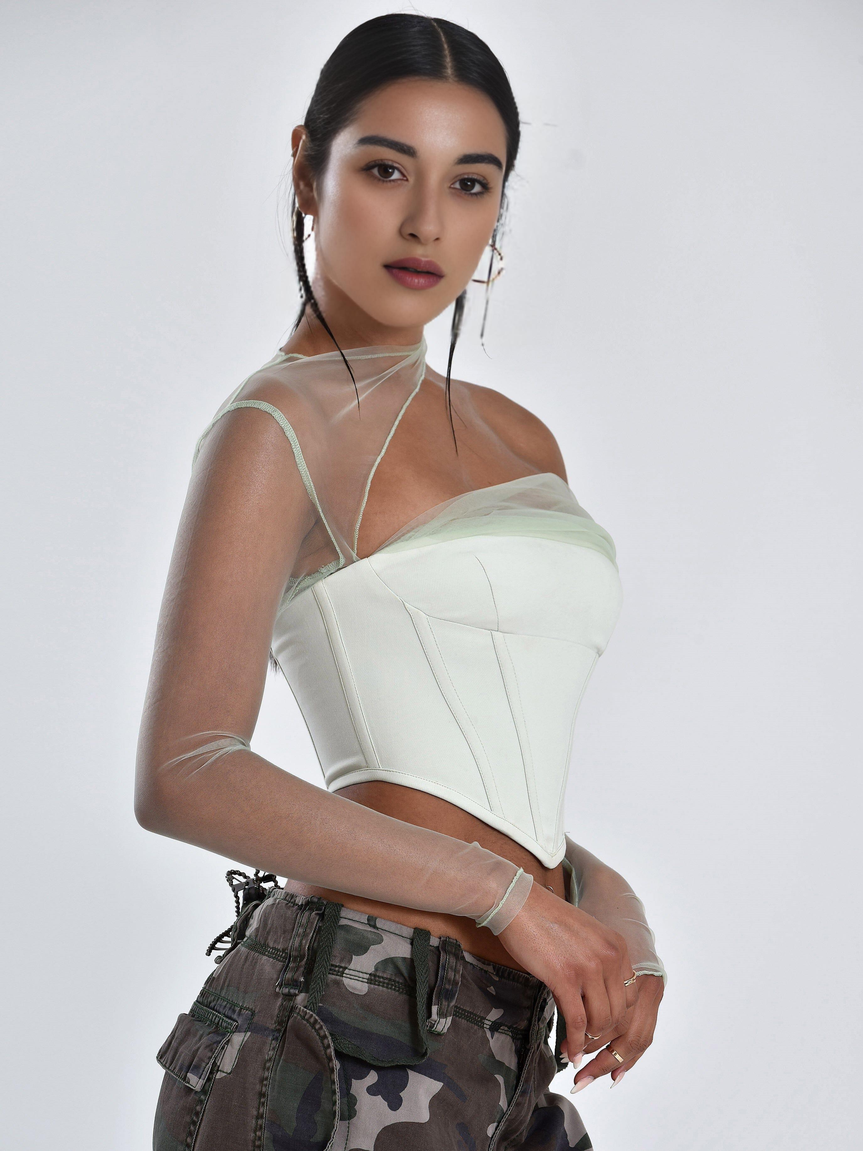 Elevate your style with the MIAH Mint Stretch Mesh Sleeve Corset Top. Whether you're dressing up for a night out or adding some flair to your everyday look, this top is sure to turn heads. Choose quality, comfort, and style with this must-have piece.