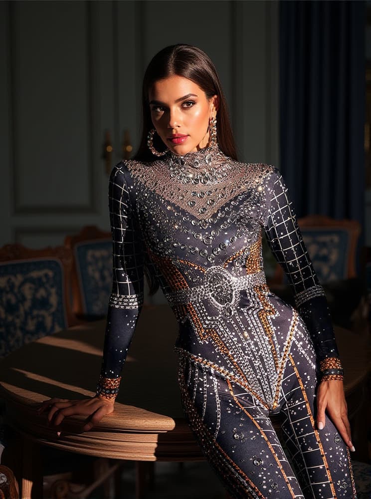 Unleash your inner fashionista with our Micaela Printed Rhinestone Jumpsuit! Designed with intricate rhinestone detailing, this jumpsuit is sure to turn heads. The perfect combination of style and comfort, it's a must-have for any special occasion. Elevate your wardrobe and make a statement with this stunning jumpsuit!