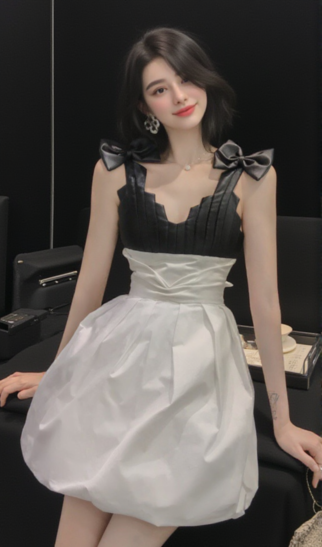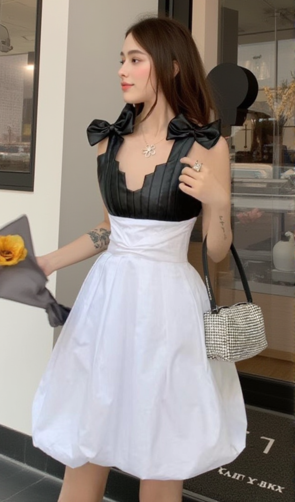 Elevate your style with the Midnight Blossom Dress, a stunning two-tone design that exudes elegance and charm. Featuring a structured black bodice with delicate bow straps and a scalloped neckline, this dress transitions seamlessly into a voluminous white bubble skirt for a playful yet sophisticated silhouette. Perfect for cocktail parties, evening events, or any occasion where you want to make a memorable impression.