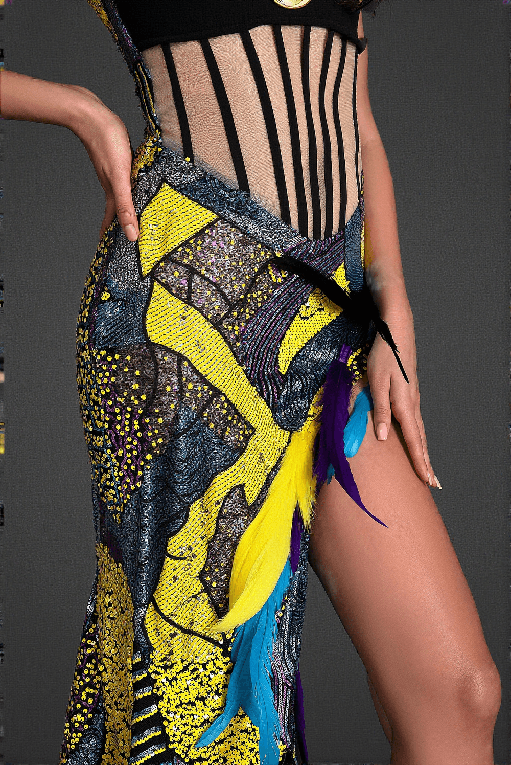 This exquisite corset feather high slit dress is designed to captivate and enchant. With its off-shoulder silhouette and shimmering sequins, this gown offers a blend of elegance and boldness that guarantees you'll stand out at any event.