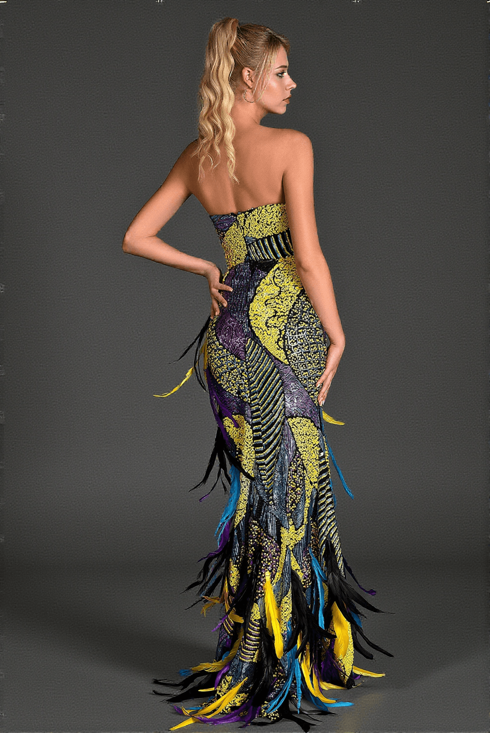 • Dramatic High Slit: Adorned with delicate feather detailing, the high slit adds an element of drama and movement to your walk.