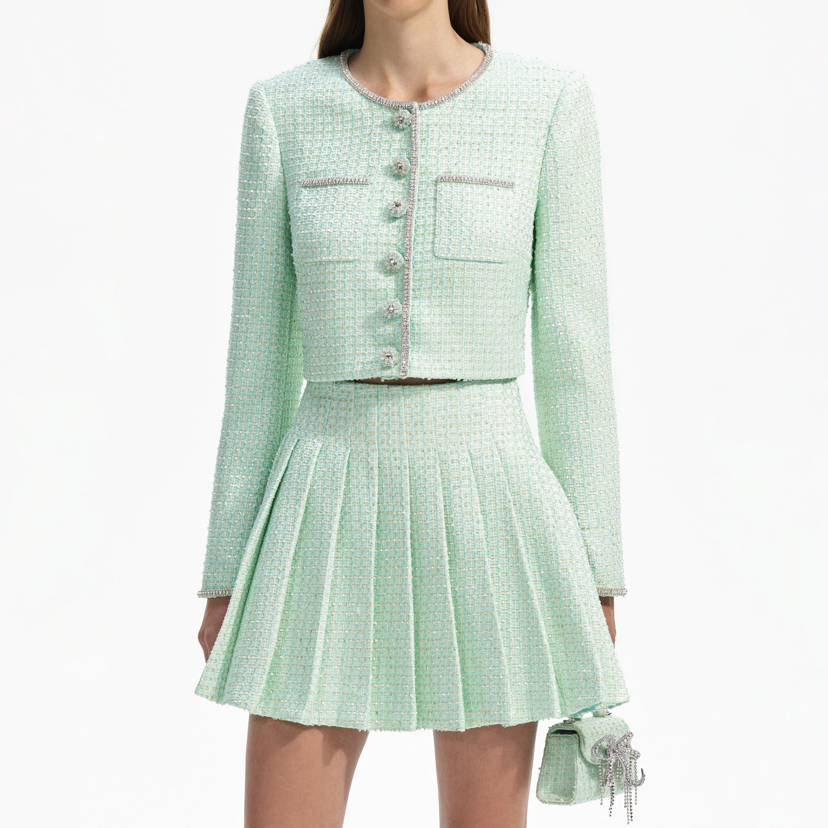 The delicate mint color adds a touch of freshness while the boucle material adds texture and depth. Elevate your wardrobe with this statement piece that exudes elegance and sophistication.
