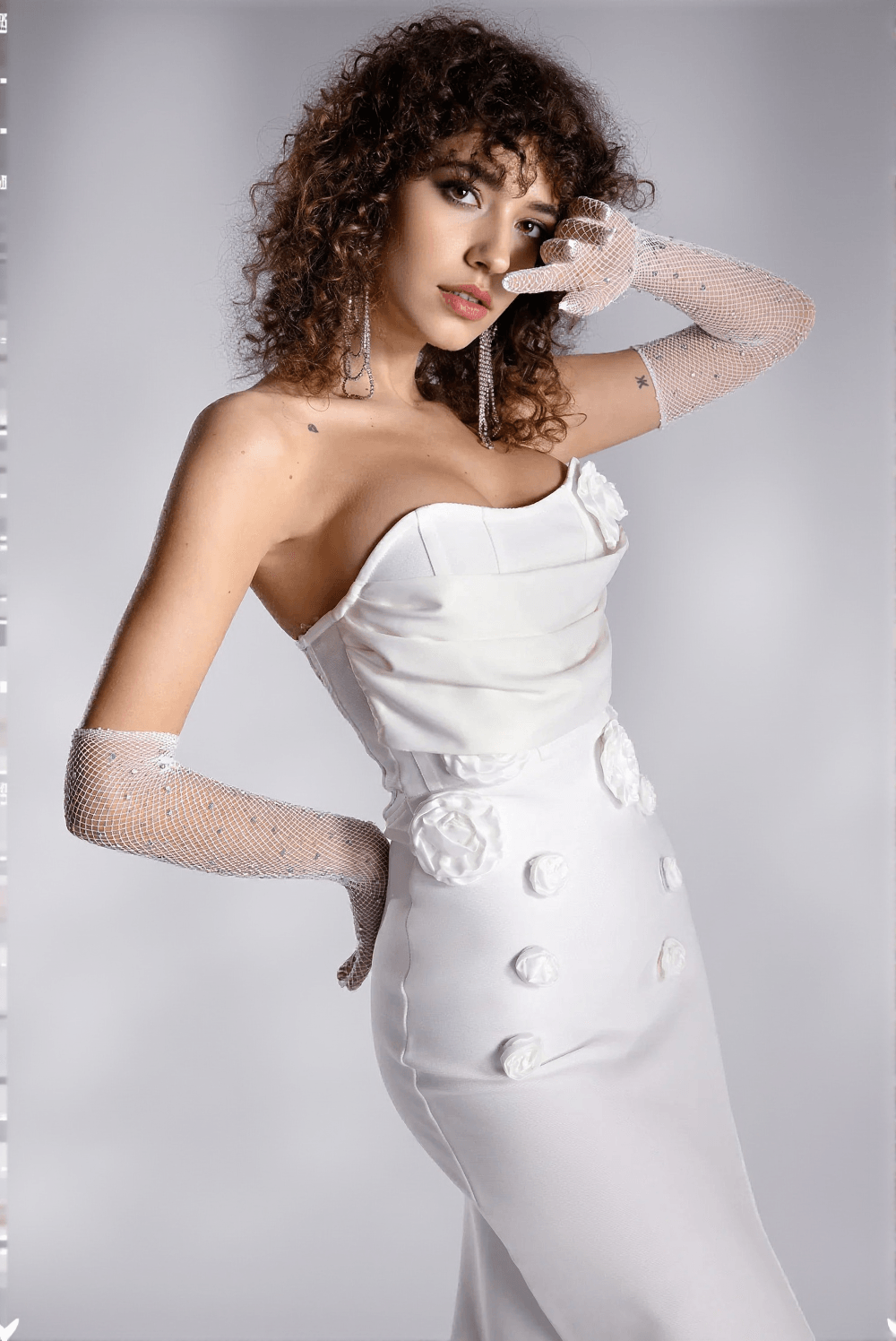The floral design is more than just beautiful—it's an art form. Each flower is carefully crafted to complement the strapless neckline and patchwork details, creating a look that is both classic and contemporary.