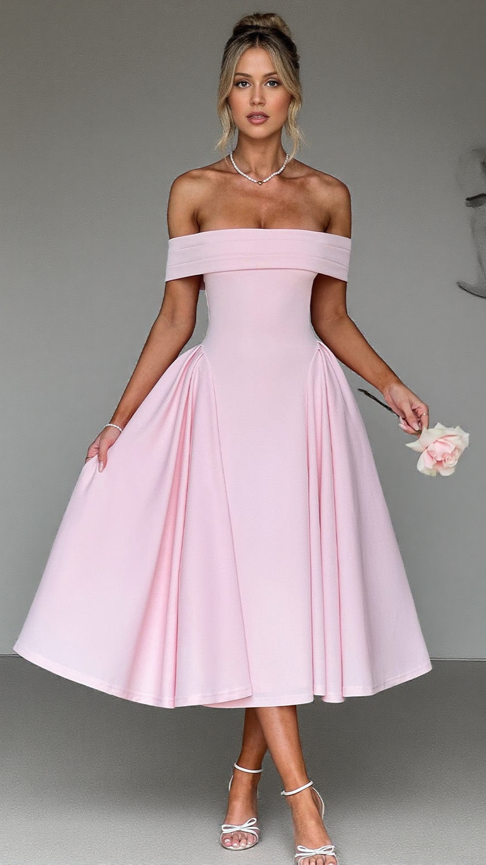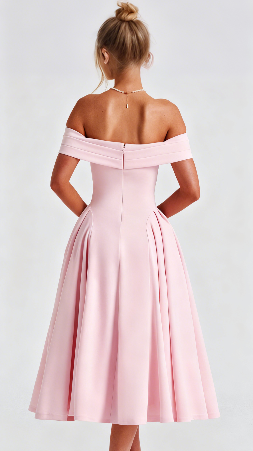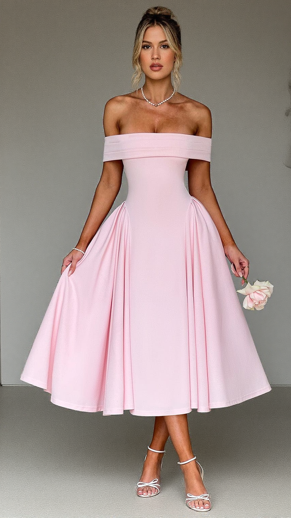 The elegant Miranda midi is made for those chic evenings, date nights and beyond. Cut from luxe stretch crepe, this style cinches at the waist with a sleek pleated bardot neckline. The look is complete with voluminous panels to each side, and tulle in the skirt for a full look. Partner with soft glam and waves.
