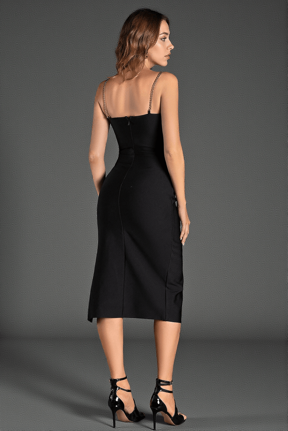 This revised product description not only adheres to SEO guidelines but also enhances customer engagement by providing detailed information about the Mireli Chain Strap Cutout Midi Dress, making it more appealing to potential buyers.