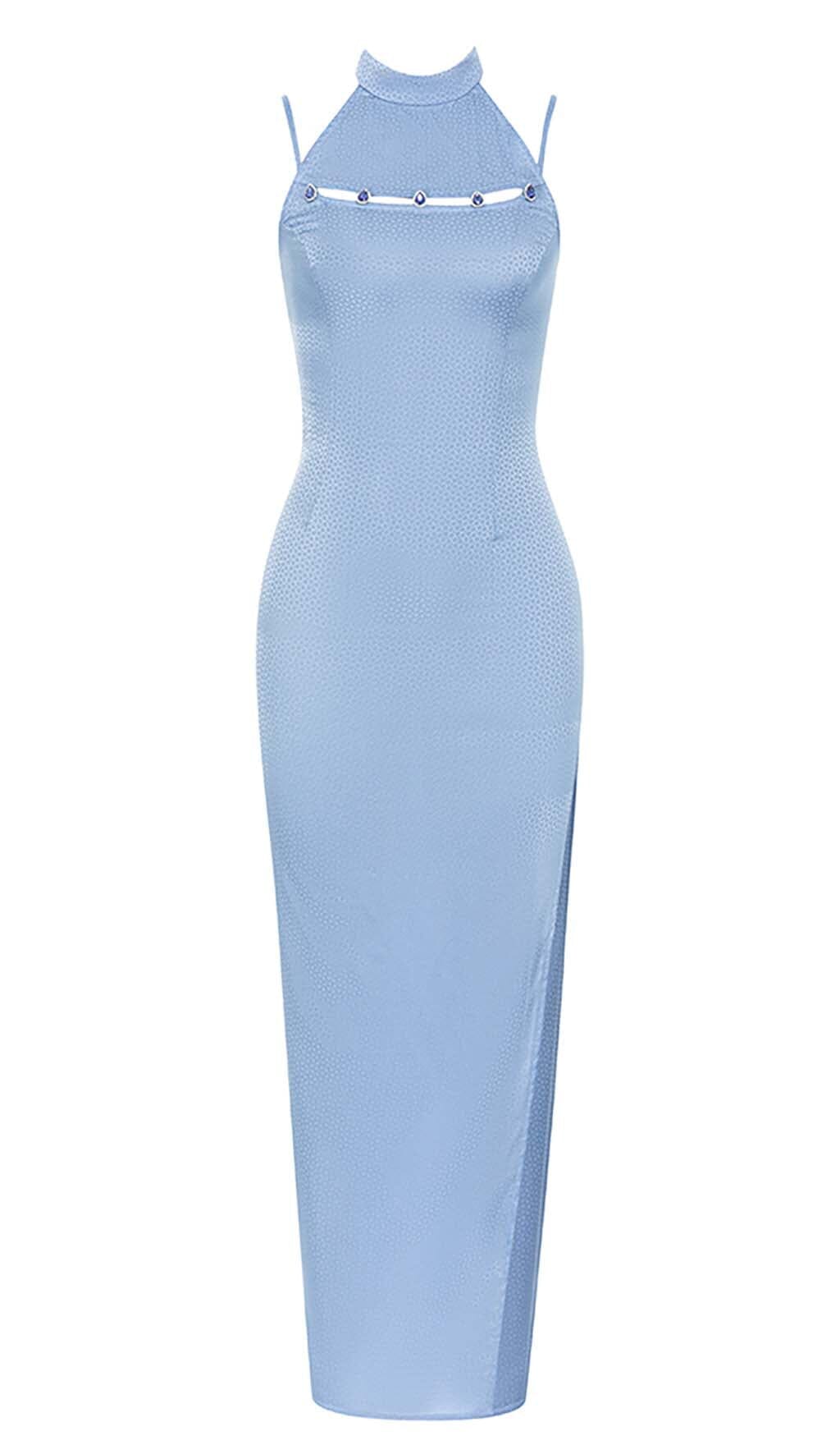 MOCK NECK SLIT MAXI DRESS IN BLUE