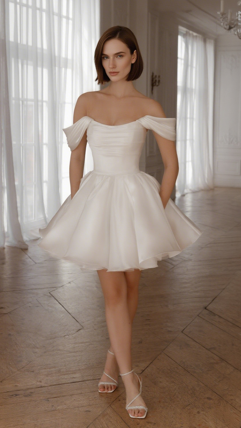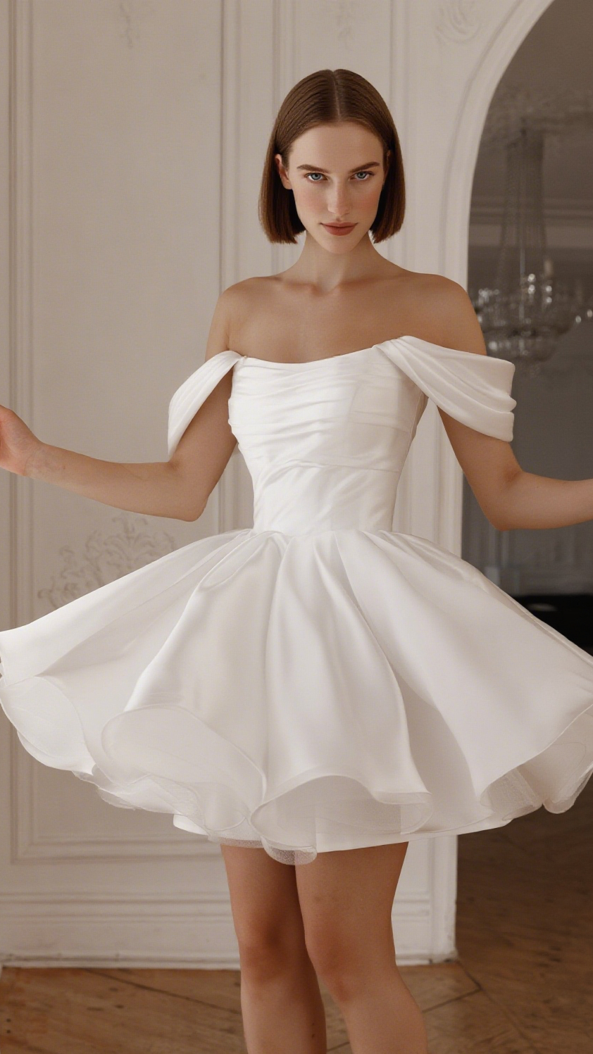 Mini length, silky touch, off-the-shoulder straps and an unusual neckline. Mix semi sweetheart and bateau cut and this is what you’ll get.