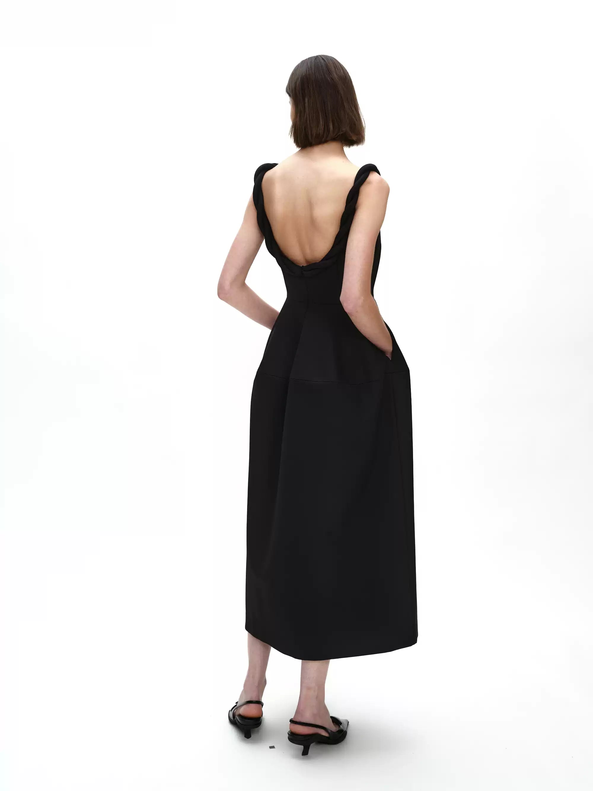 Expertly crafted with braided shoulder straps, the monica midi dress offers comfort and style. The classic black color adds versatility to any wardrobe. Made from high-quality materials, this dress provides a sophisticated look and perfect fit every time. Upgrade your wardrobe with the monica midi dress.