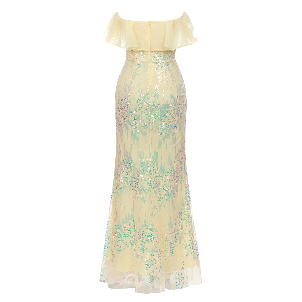 MULTICOLOR SEQUIN PATCHWORK RUFFLE HEM MERMAID MAXI DRESS