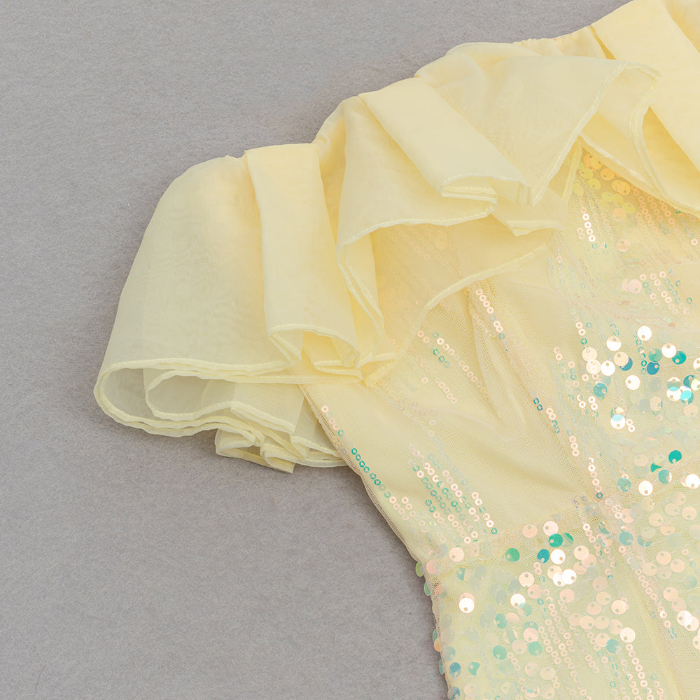 This stunning dress features intricate sequin patchwork, creating a unique and eye-catching design. The ruffle hem adds a feminine touch, while the mermaid silhouette flatters your figure. Elevate any special occasion with this elegant and exclusive dress.