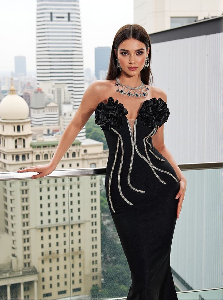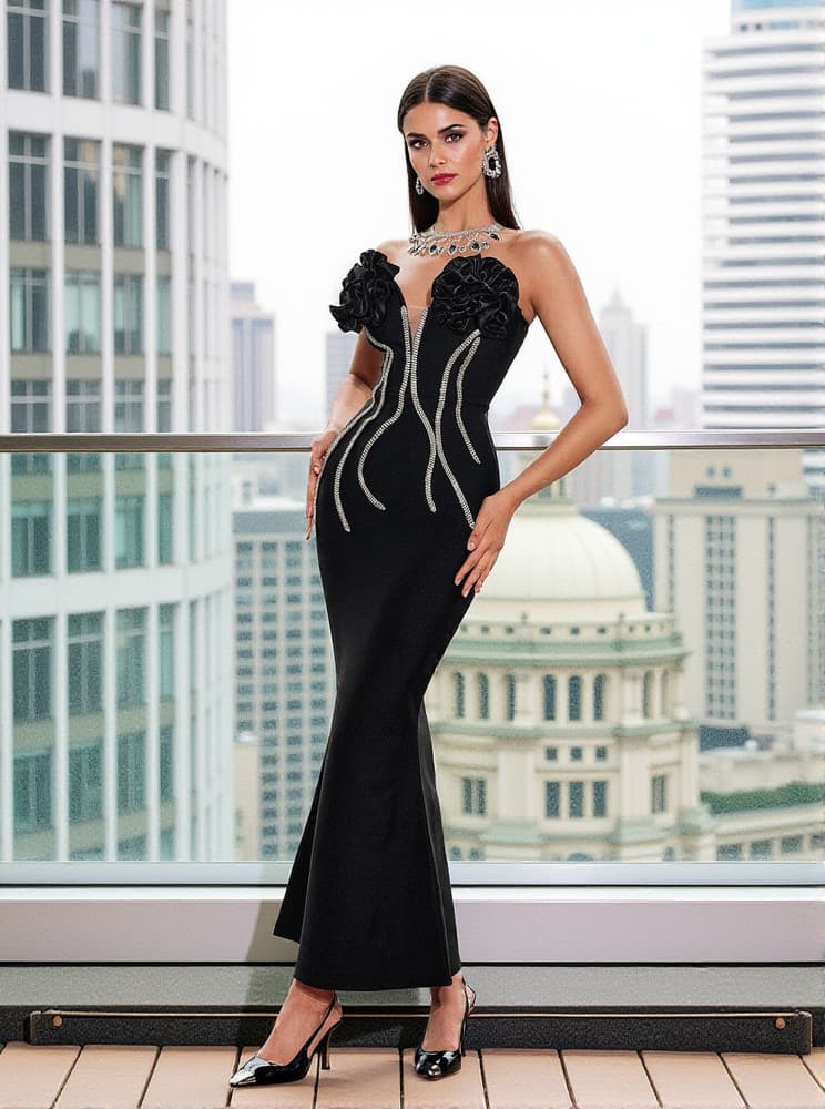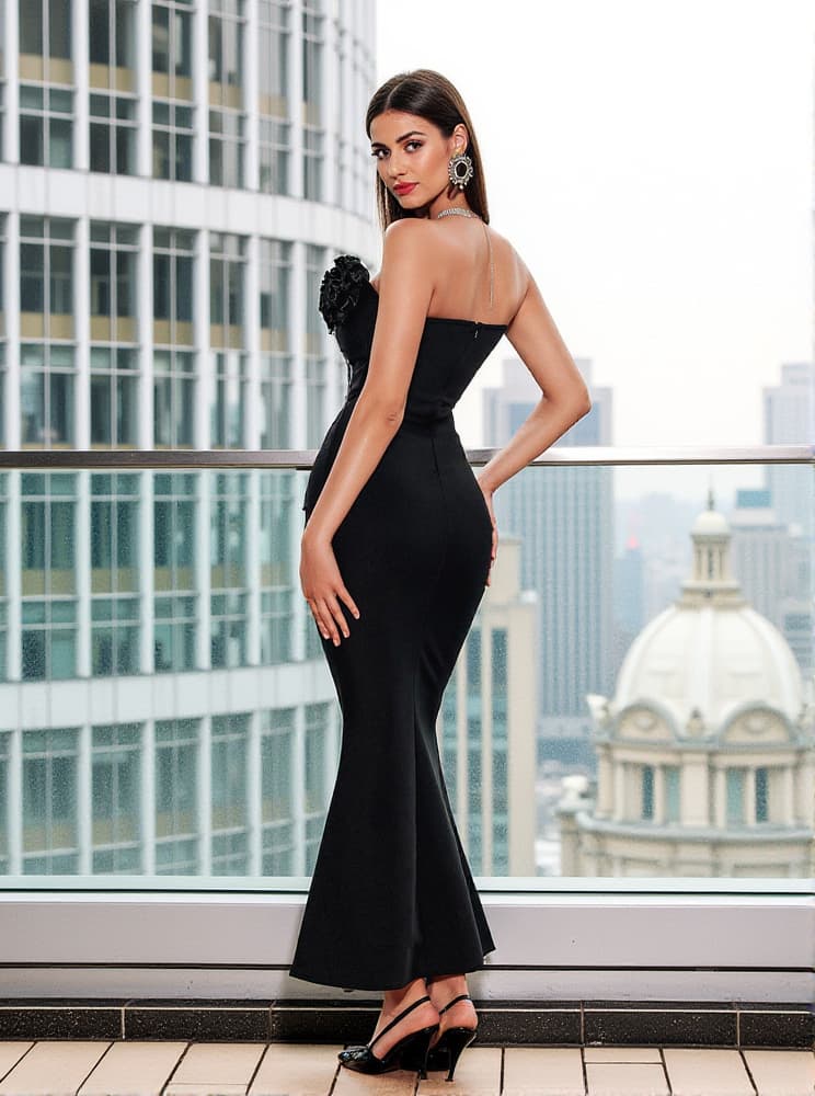 Musa Strapless Crystal Flower Bandage Dress In Black