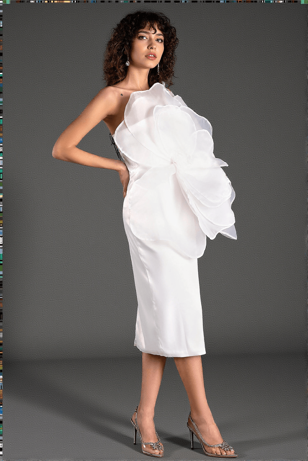 Mustelis One Shoulder 3D Floral Midi Dress