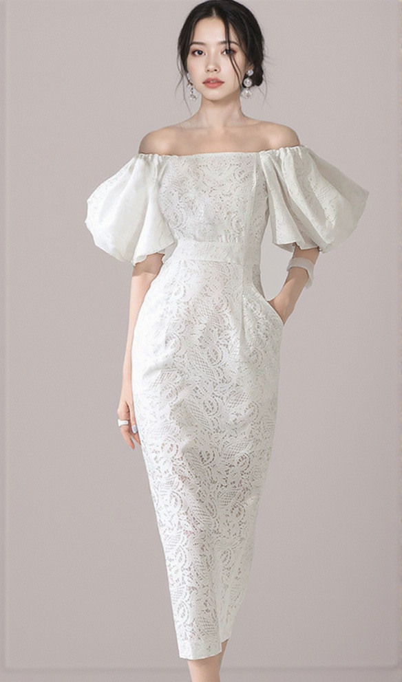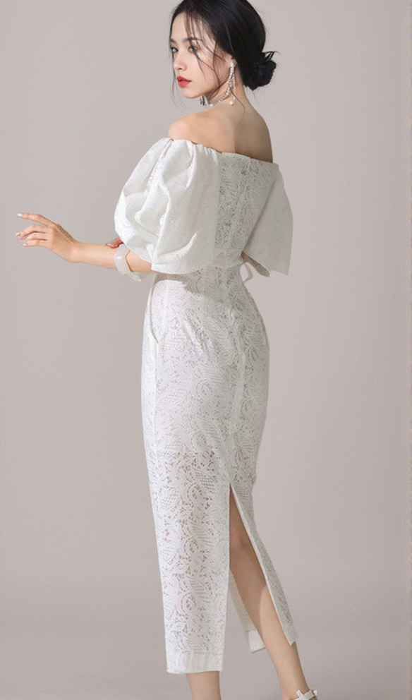 NATALIE PUFF SLEEVE OFF SHOULDER WHITE LACE MIDI DRESS