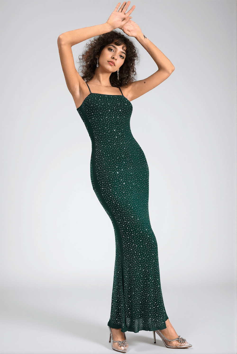 The captivating emerald green hue exudes an aura of sophistication and glamour, instantly catching the eye and setting your ensemble apart from the crowd. The dress's mermaid silhouette is crafted to hug every curve with precision, creating a flattering yet alluring silhouette that flatters any figure.