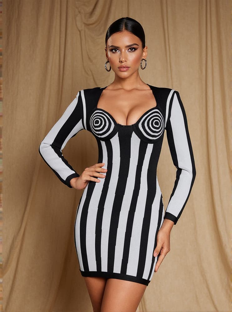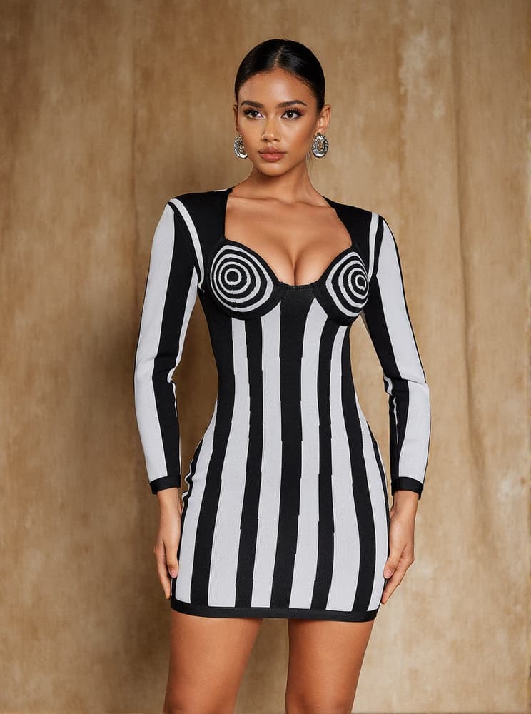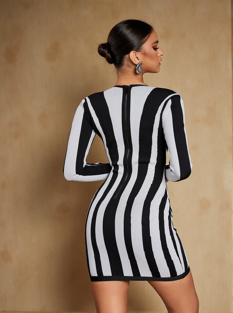 Introducing the Nehir Long Sleeve Stripe Bandage Mini Dress! This eye-catching dress is designed with long sleeves and a flattering stripe pattern. Made with a comfortable and form-fitting bandage material, it hugs your curves and accentuates your figure. Perfect for any occasion, this dress will make you feel confident and stylish.