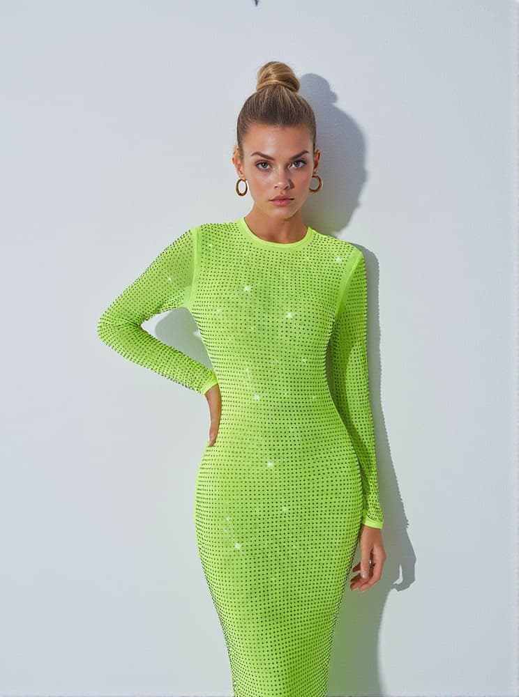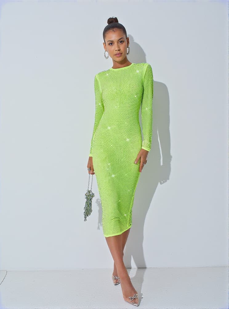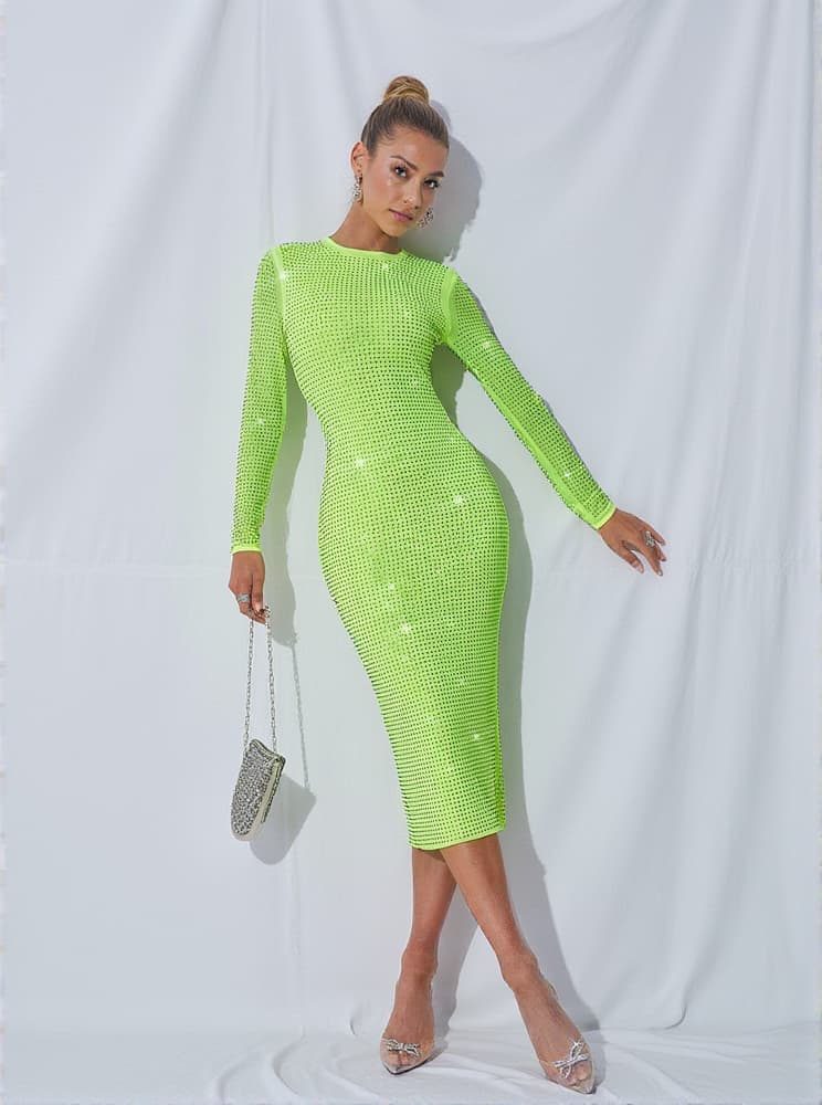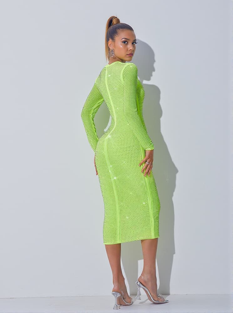Turn heads in this Neriah Crystal Embellished Midi Dress In Green, presented in an eye-catching shade of lime-green overlaid with rhinestones. With a stretch fit that hugs the figure in all the right places, the midi length and long sleeves keep the silhouette looking sophisticated. Slick your hair back and pair it with stilettos for an extra dose of glamour.