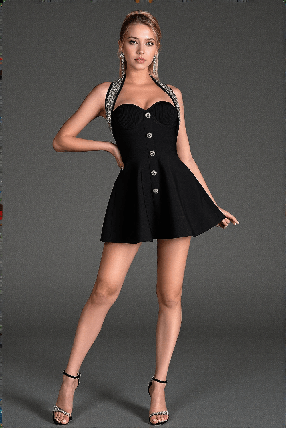 The model showcases the Nestoras Crystal Halter Mini Dress in her preferred size, highlighting how perfectly it fits and flatters any silhouette.