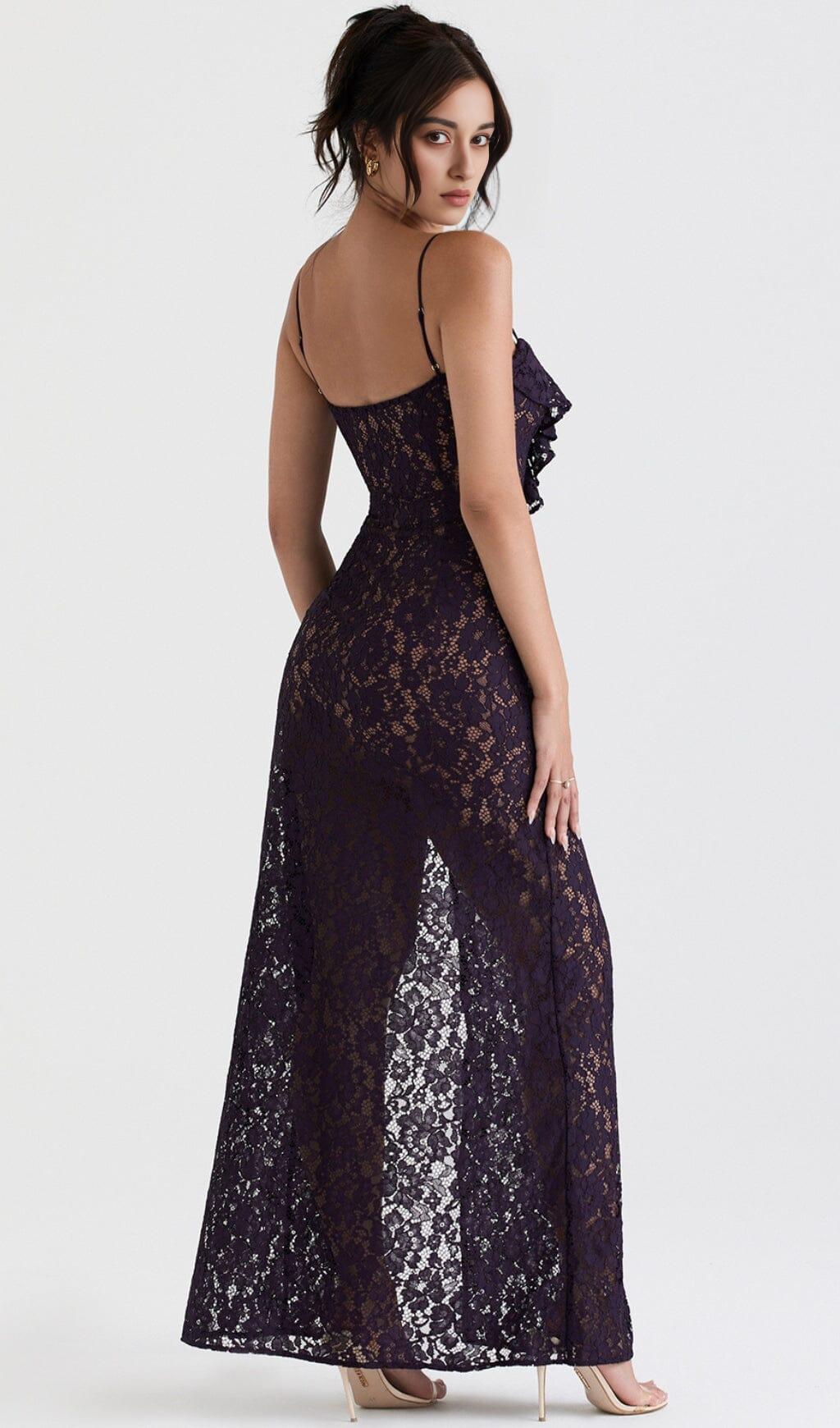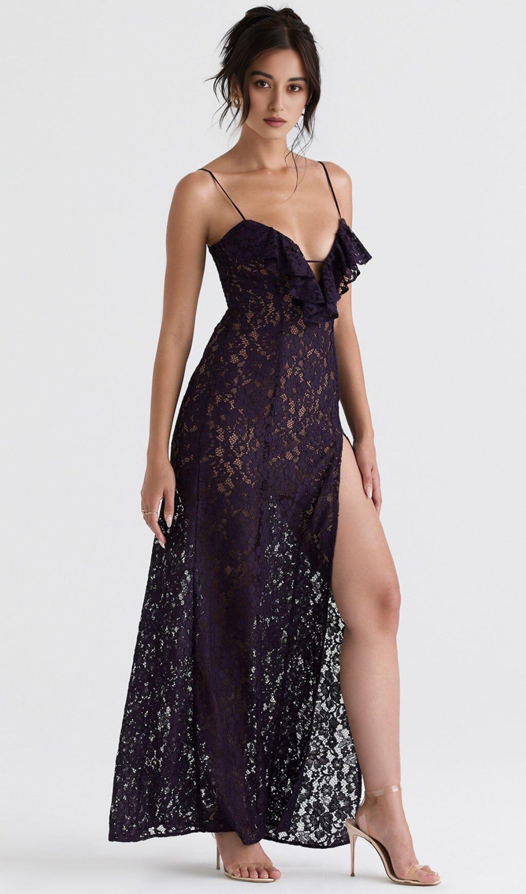Making women feel beautiful is our obsession and our Night Shade Lace Maxi Dress captures this sentiment perfectly. It's created from corded lace and backed in our special power mesh to mid thigh for modest coverage and a cinched-in fit. The frilly ruffles along the v-neckline are ultra-flattering, held by adjustable satin straps to ensure a comfortable fit. The body-skimming fit and thigh split make for a perfect combination. It has a zip to the left side for easy on. Wear yours with delicate heels for a style you'll turn to for those glamorous events.