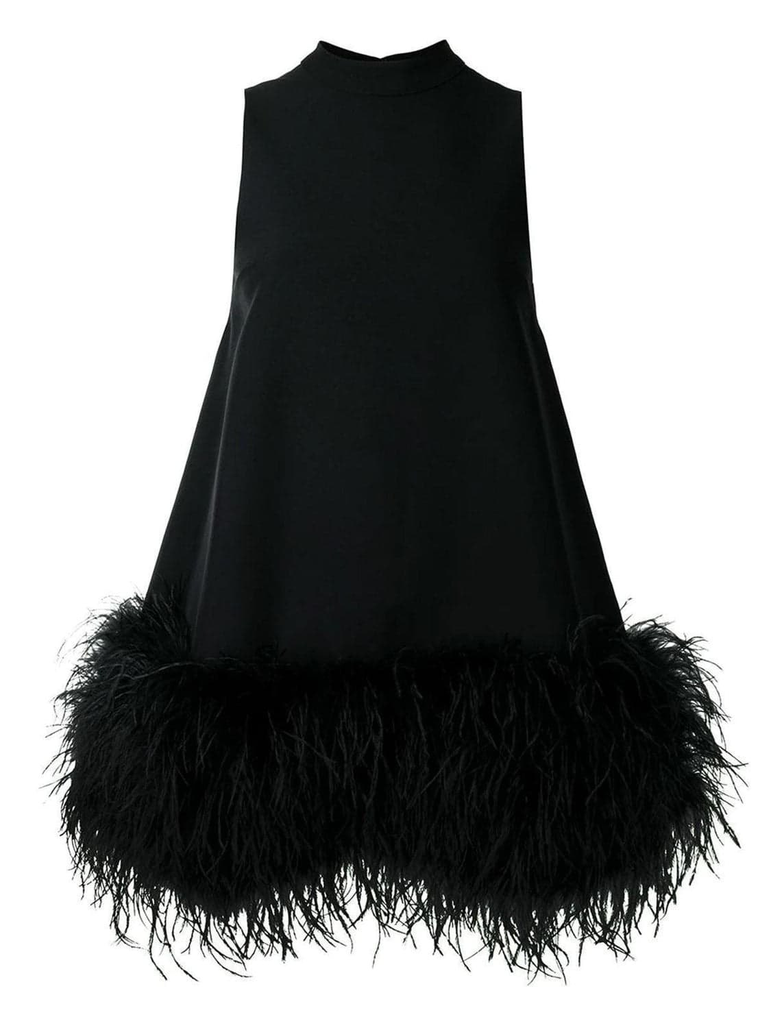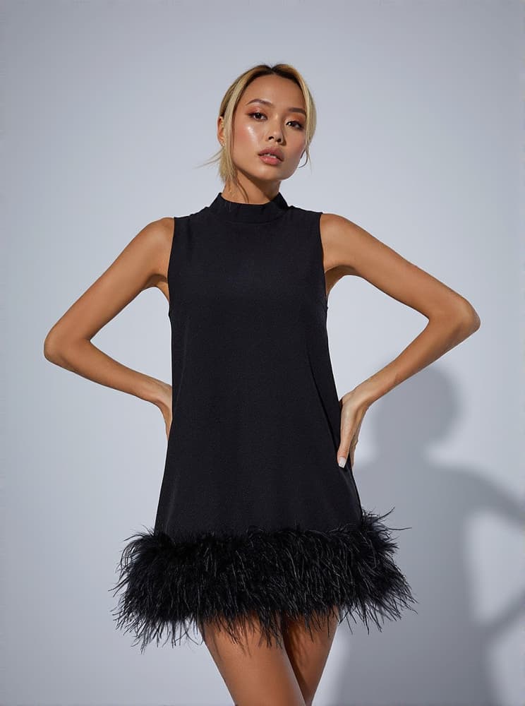 The Nisha Feather Mini Dress In Black featuring a raised neckline and ostrich feather hemline cut to a flattering a-line silhouette.