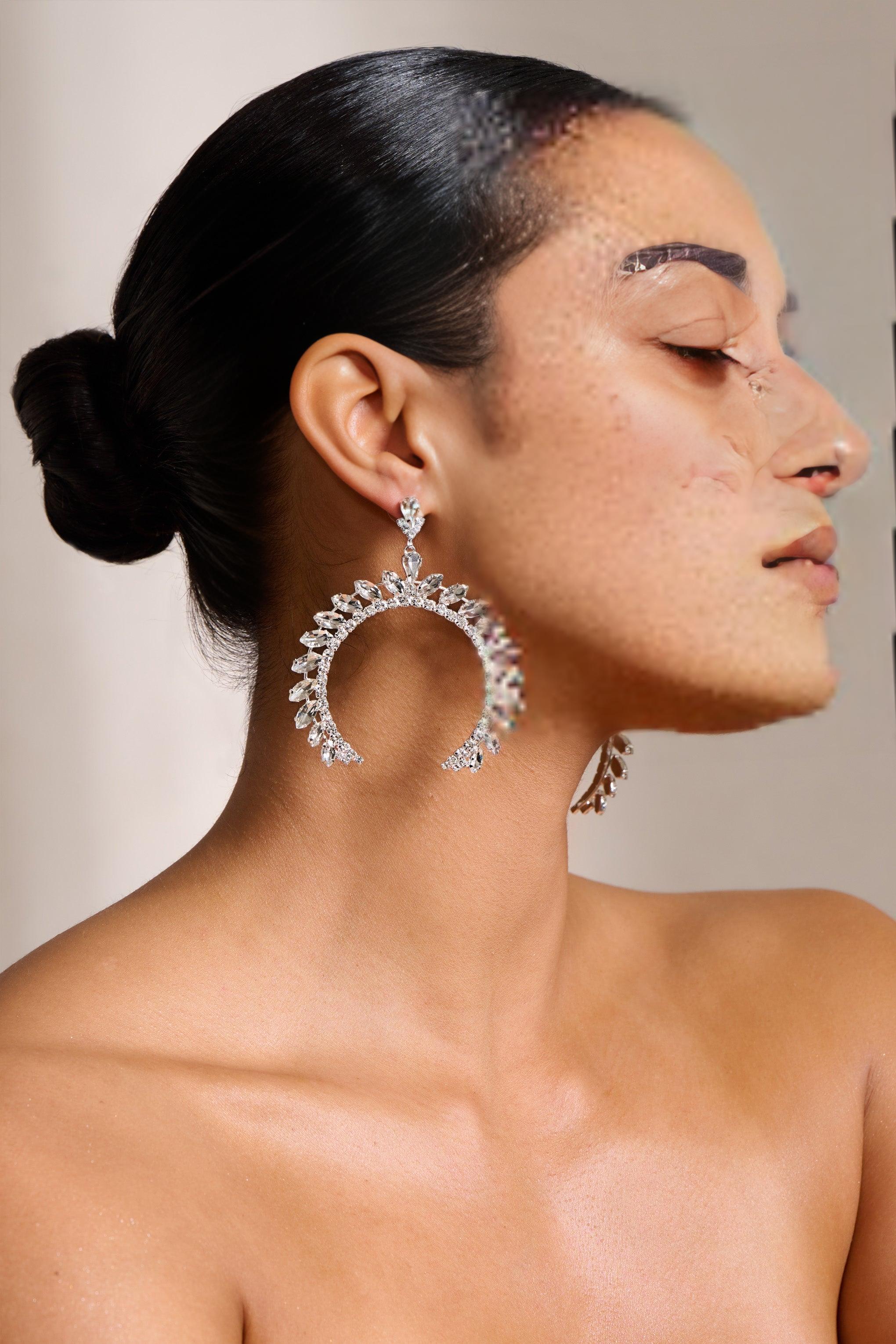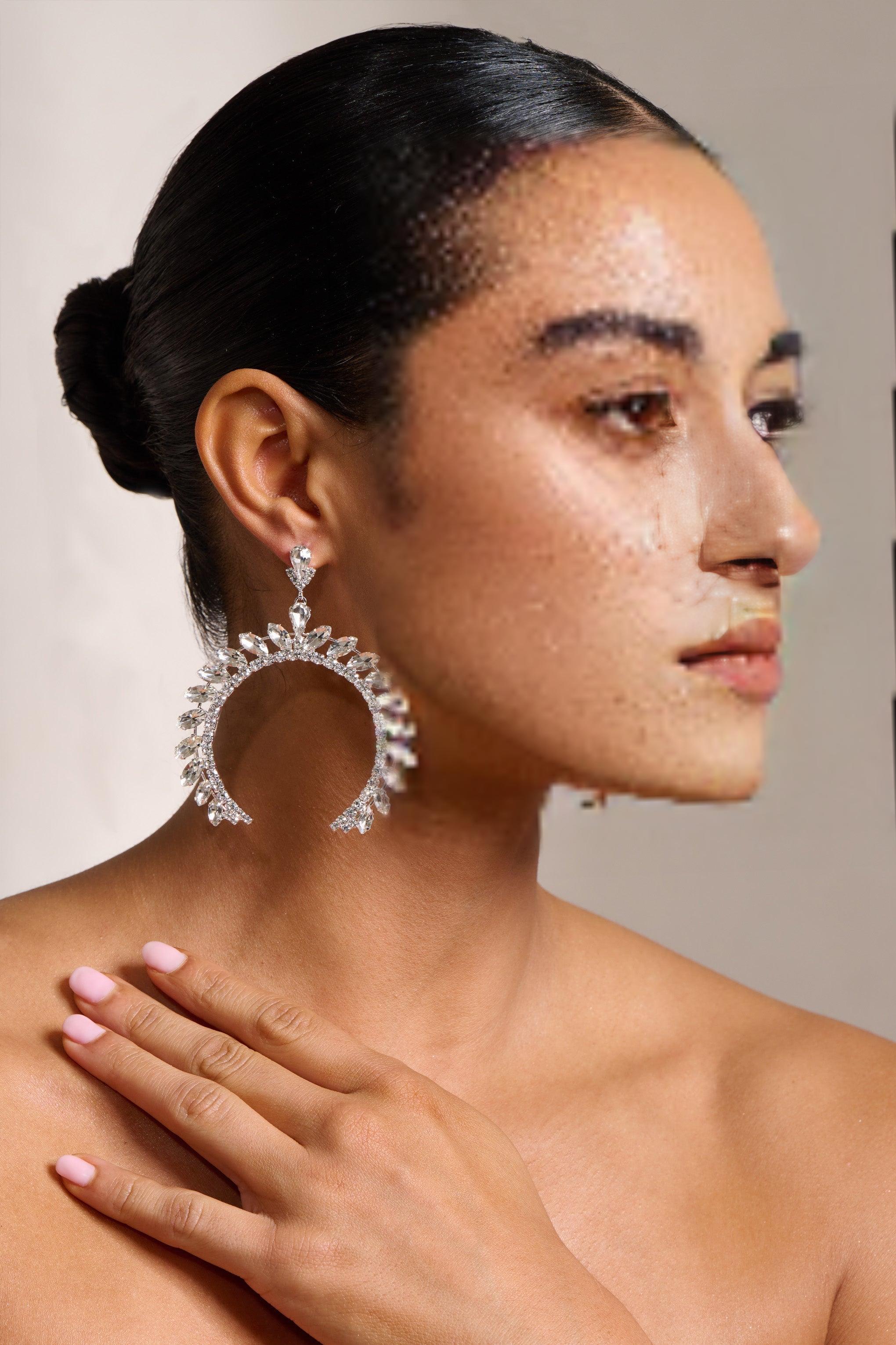 Make a sparkling statement with our Silver Crystal Arched Shape Drop Earrings. These unique earrings are the perfect addition to your formal wardrobe, adding a touch of elegance and glamour to any outfit.