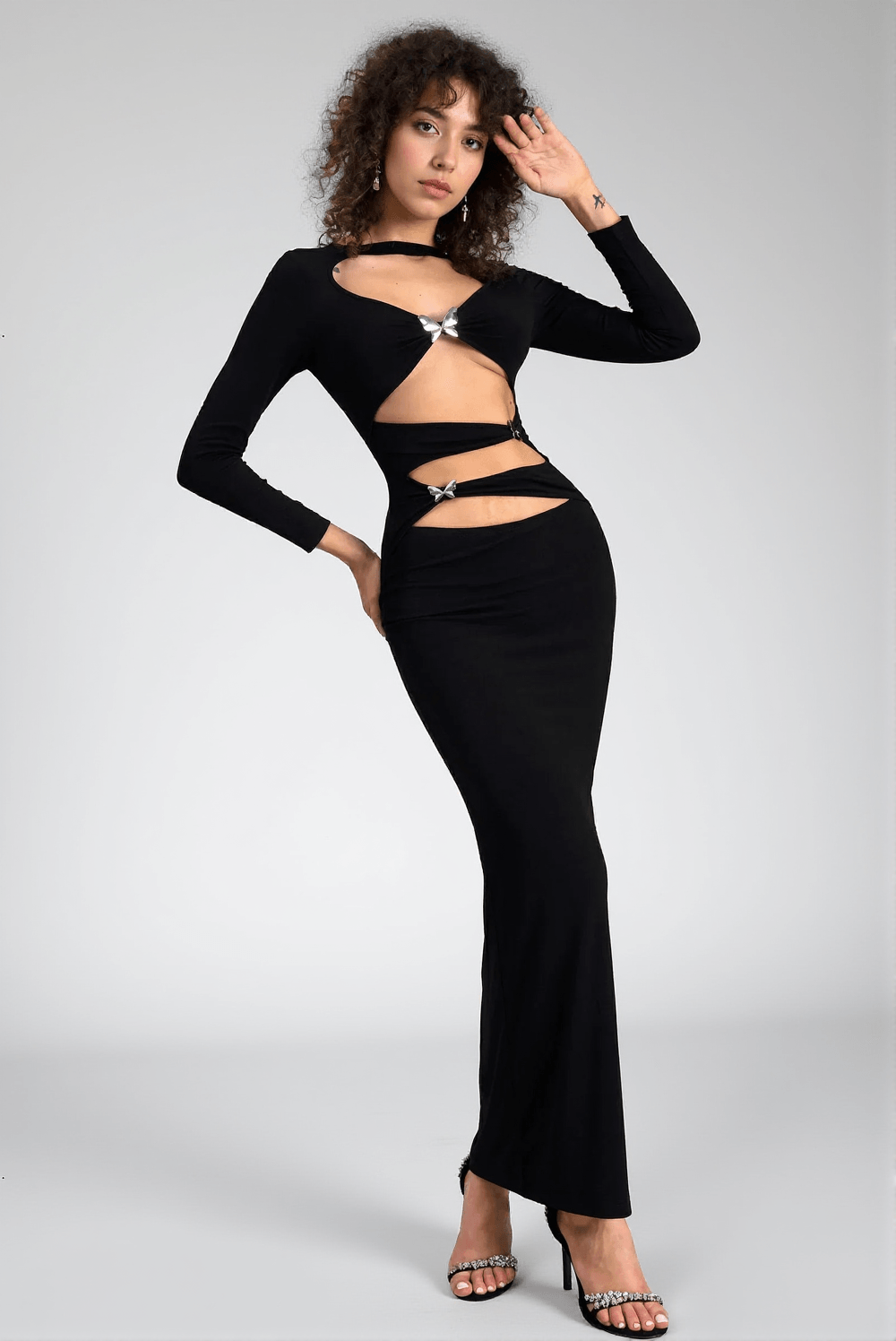 The Nomiki Long Sleeve Cutout Maxi Dress is a breathtaking blend of sophistication and allure, designed to elevate the art of eveningwear. This ensemble is meticulously crafted with an attention to detail that ensures it makes a statement at every occasion.