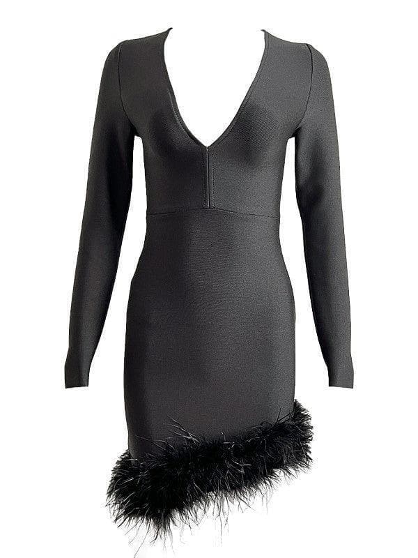 Nori Long Sleeve Feather Trimmed Bandage Dress In Black