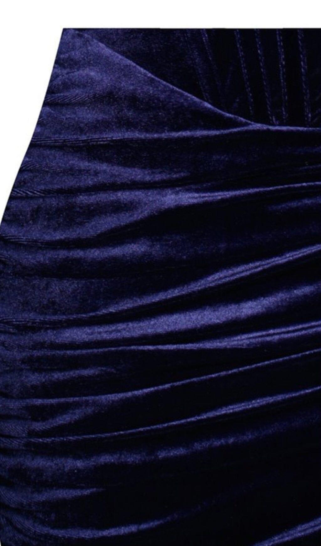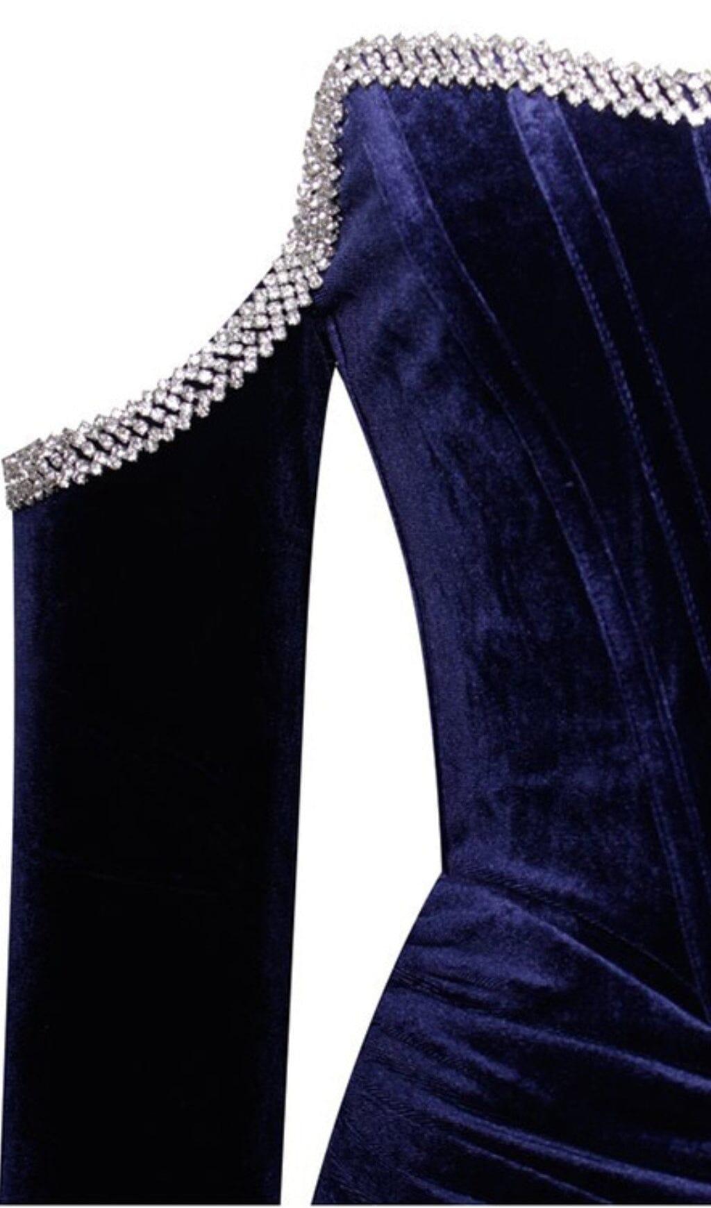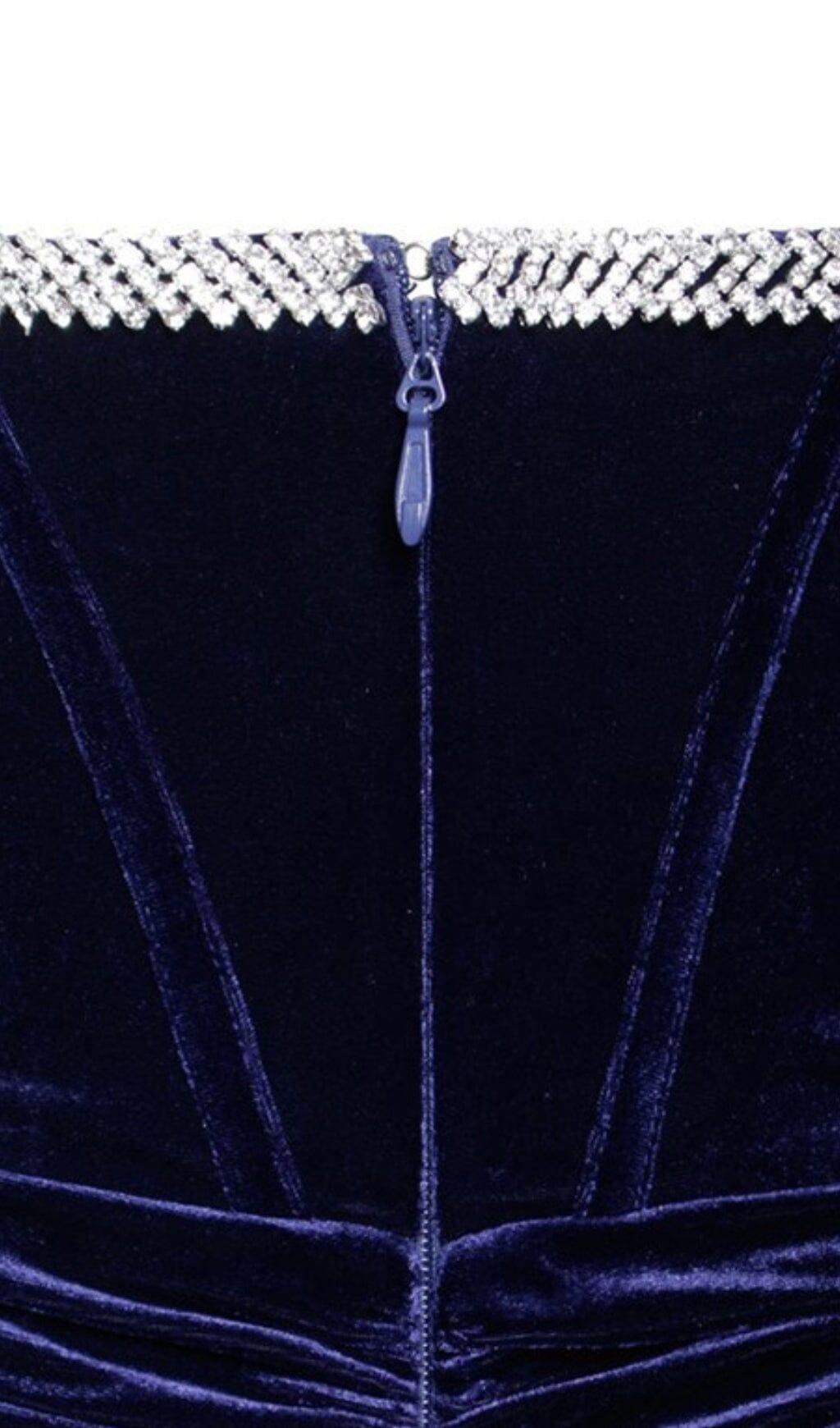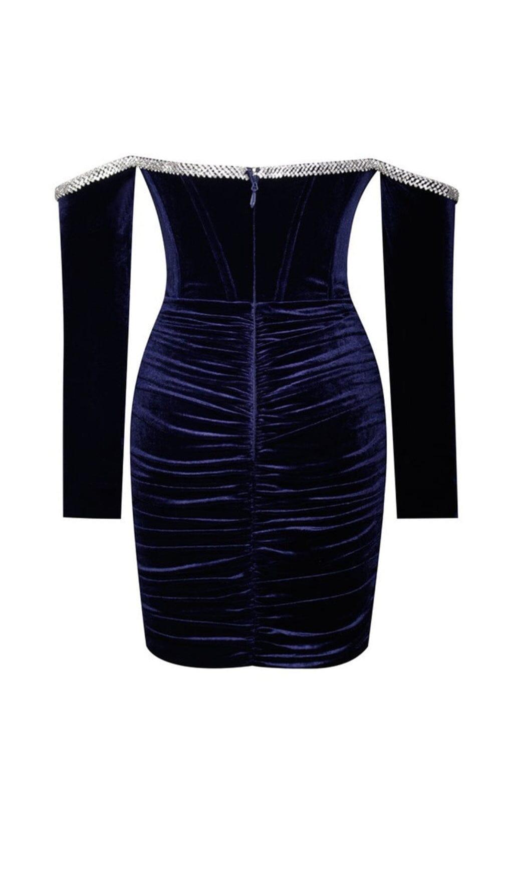 ODETTE NAVY VELVET OFF SHOULDER CORSET DRESS WITH CRYSTAL TRIM