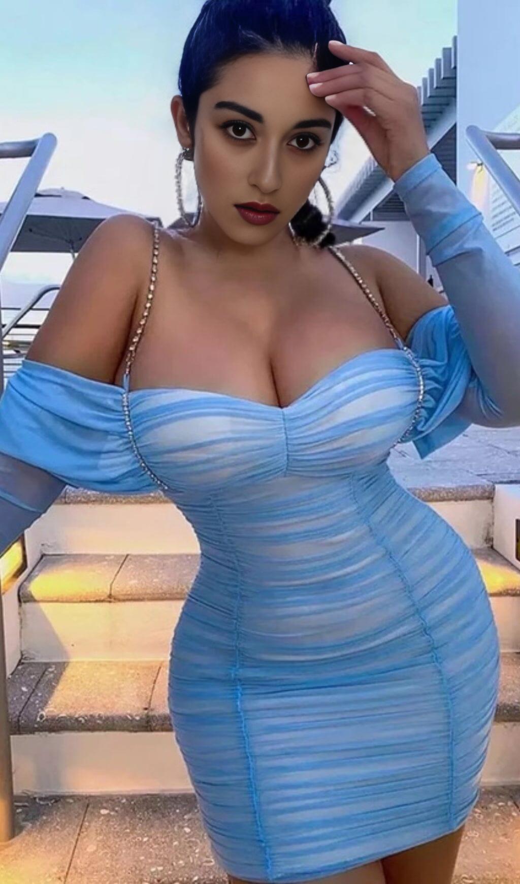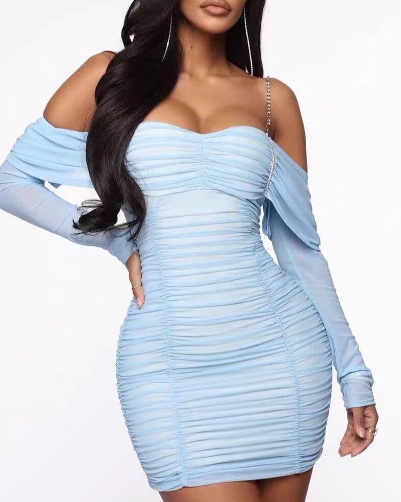 The Off Shoulder Mesh Skinny Mini Dress in Light Blue is a stunning piece that will make you feel like a mermaid princess. The dress features a fantastic light blue mesh material with a stacking effect, reminiscent of rhythmic ocean ripples. It is adorned with shiny diamond decorations, adding a touch of glamour and making you look as beautiful as the undersea treasure you are searching for.