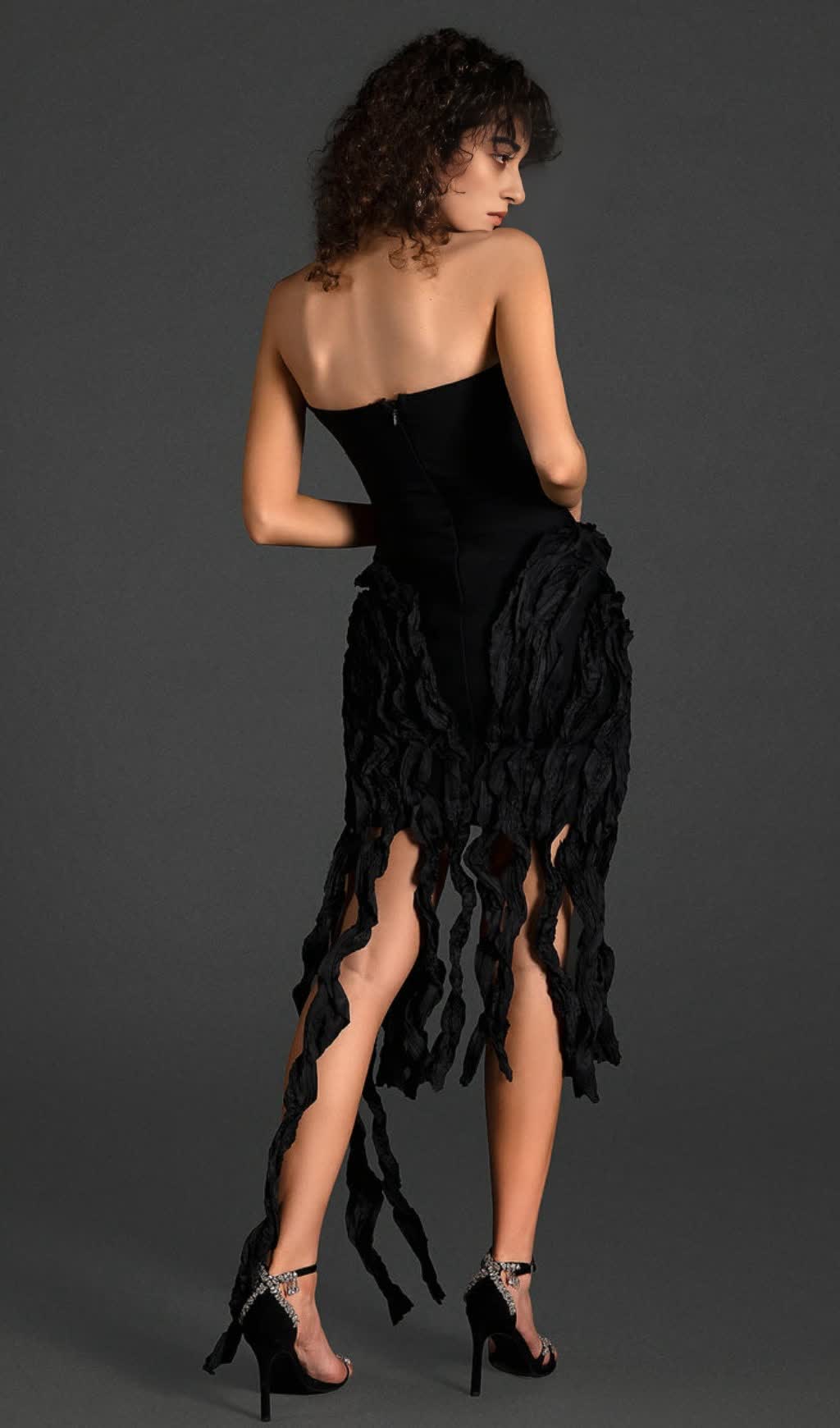 OFF SHOULDER PLEAT RUFFLE DRESS IN BLACK