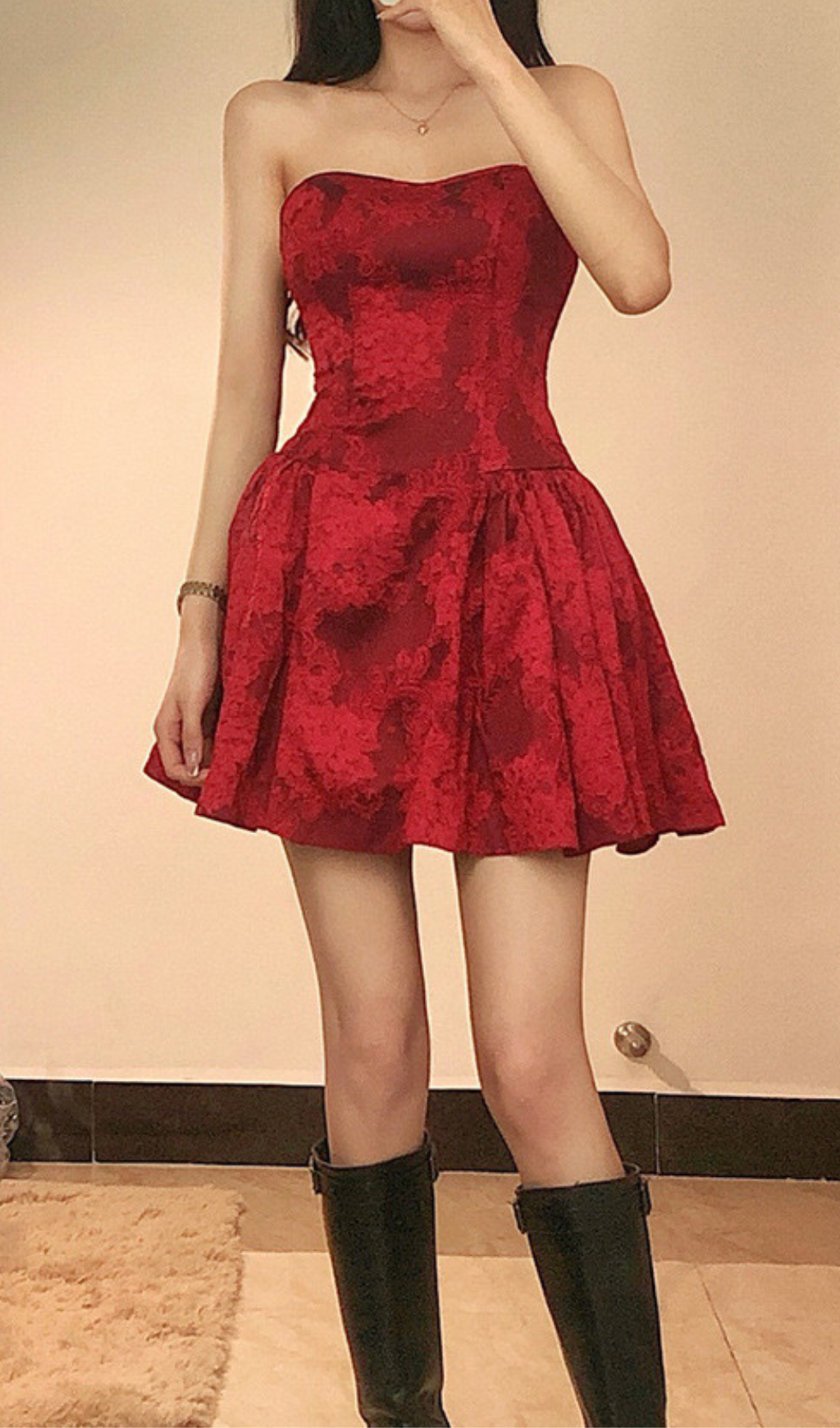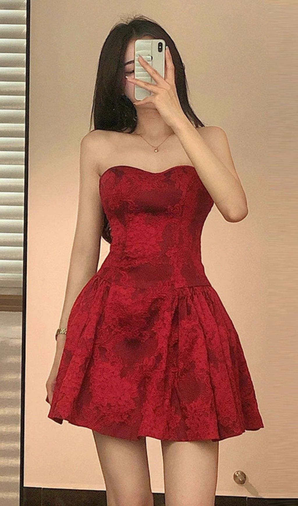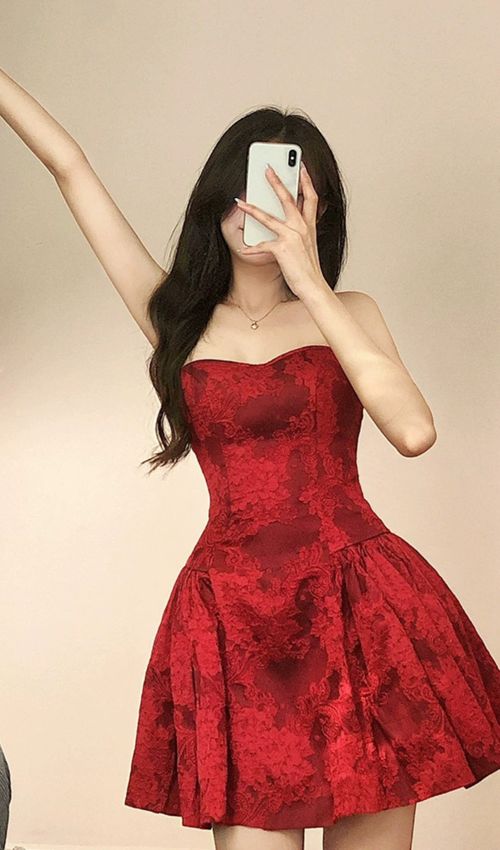OFF SHOULDER PRINTED MINI DRESS IN RED