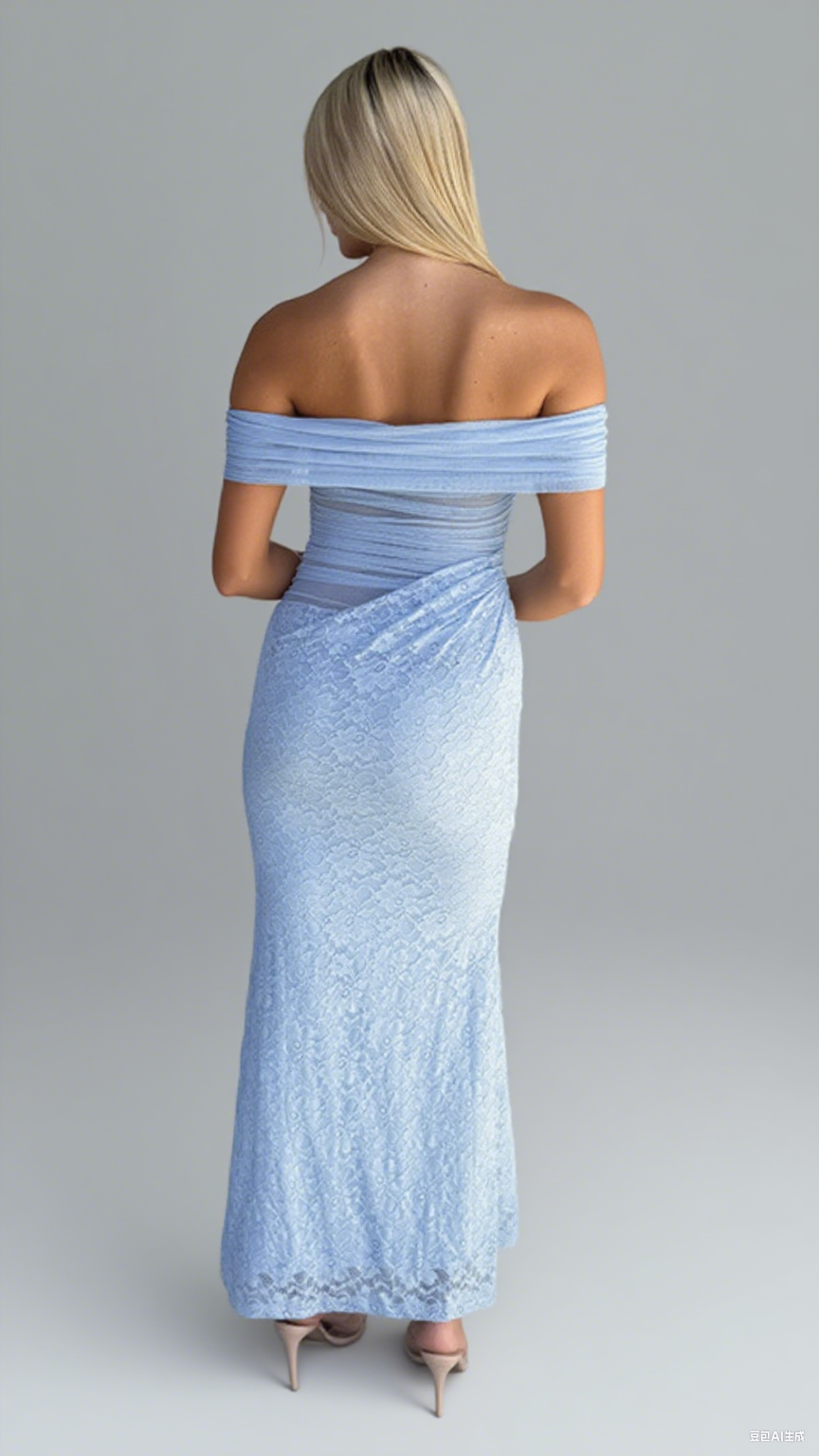 Off Shoulder Ruched Lace Midi Dress in Light Blue
