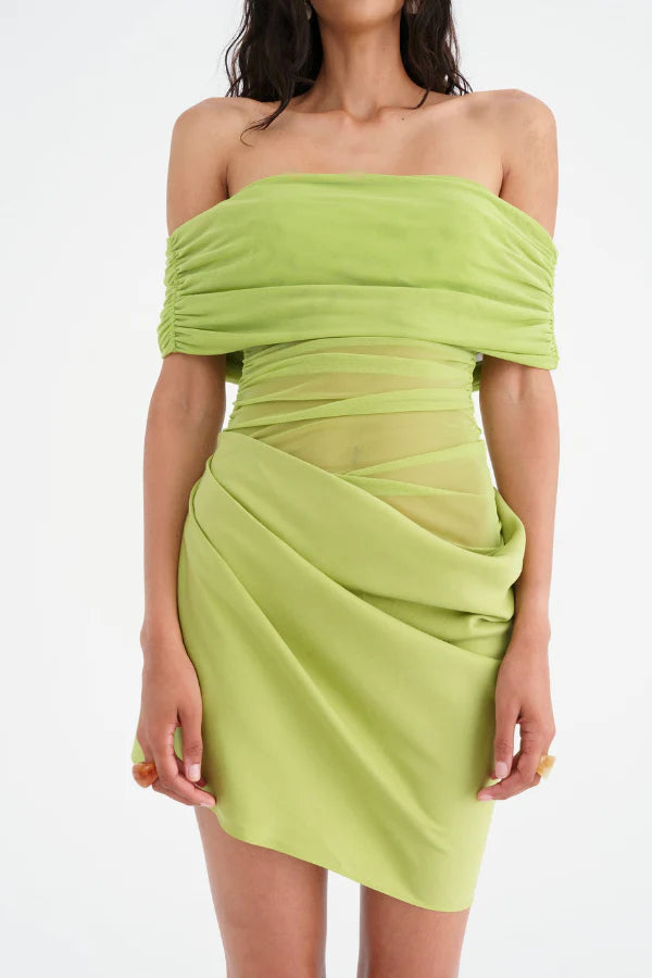 Off Shoulder Ruched Mesh Mini Dress in Green