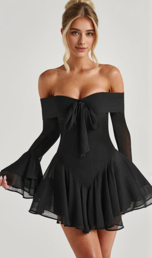 Off-shoulder tie long-sleeved mini dress black