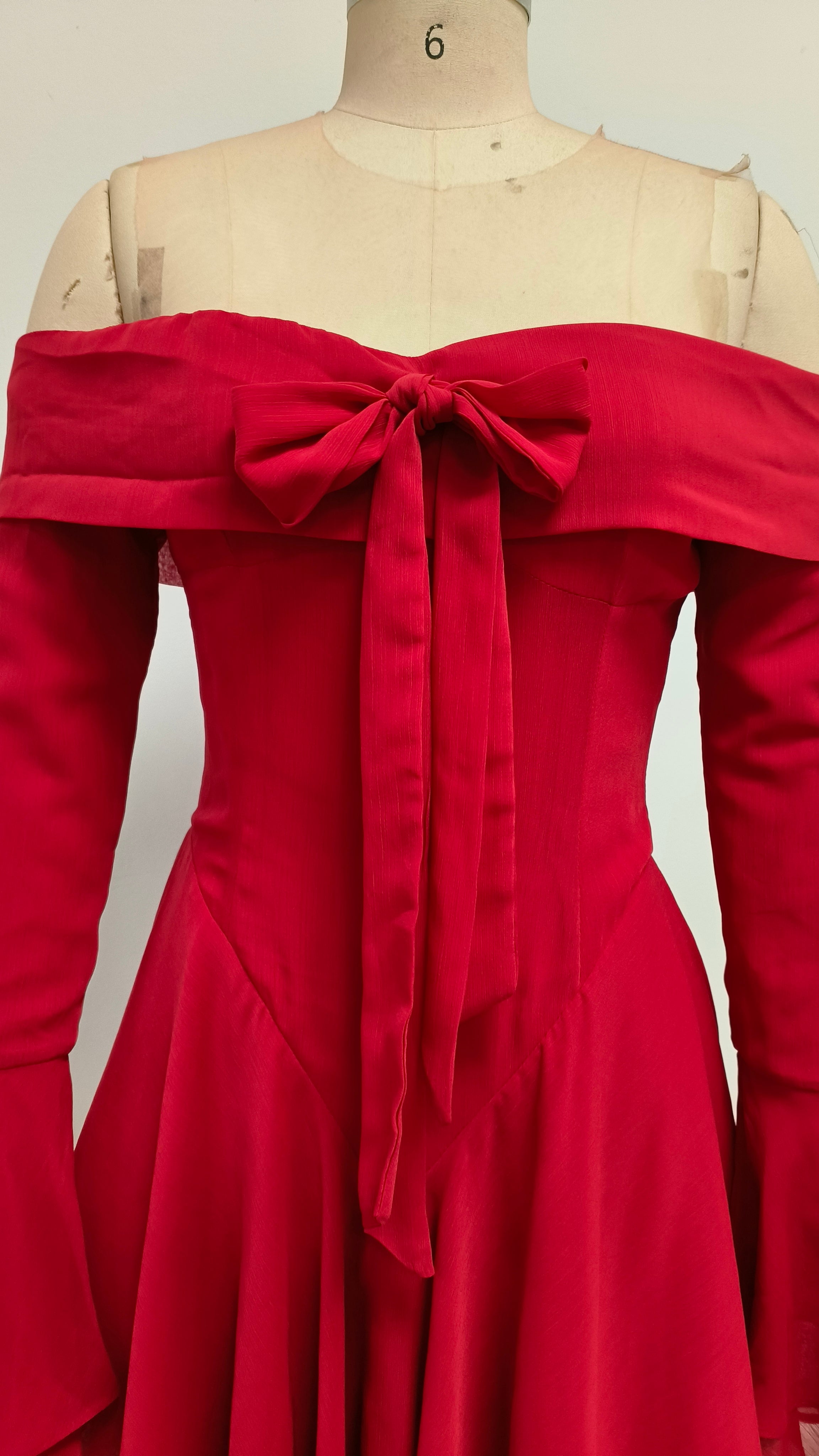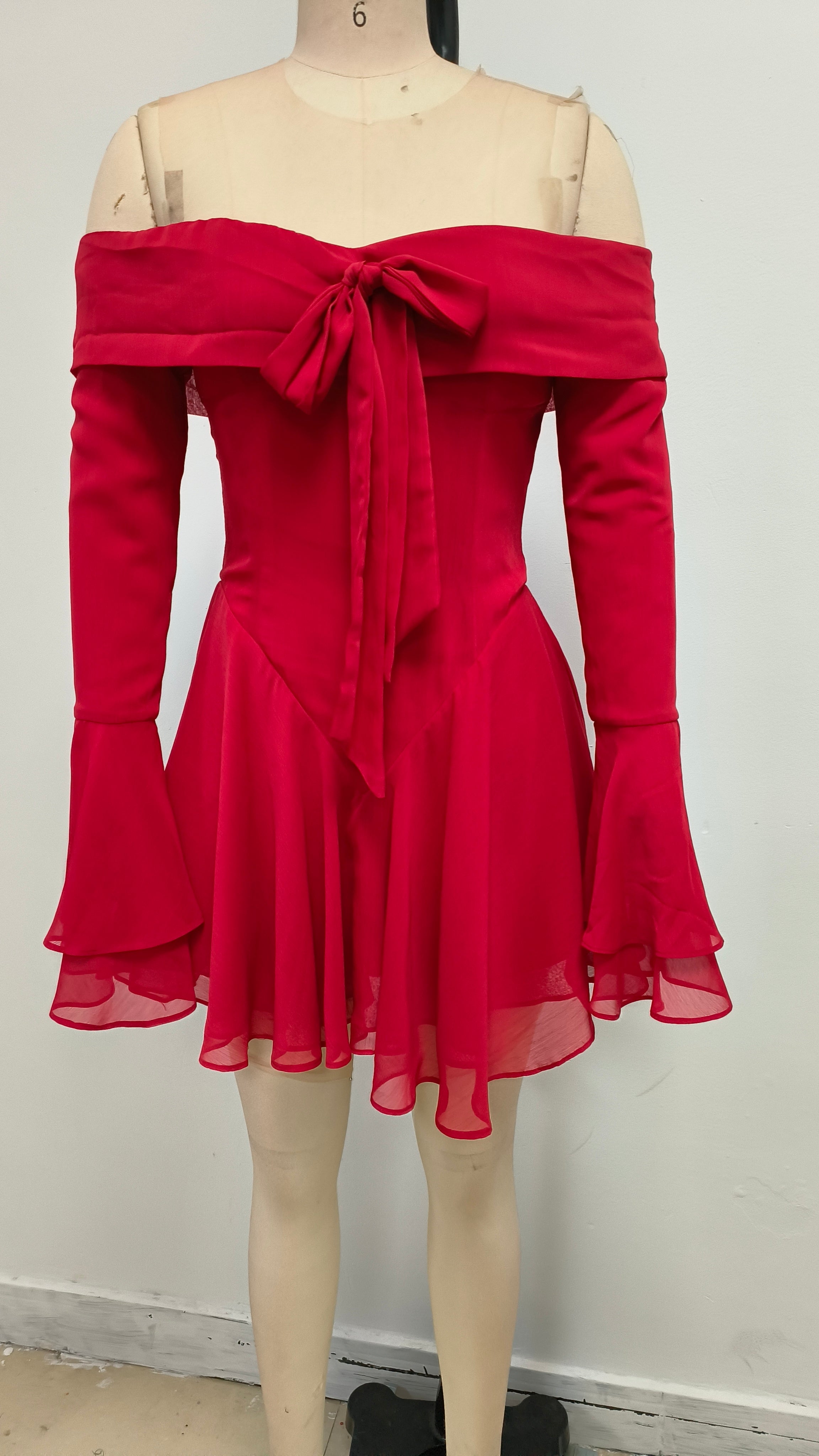 It adds a sense of romance. Meanwhile, the bow - tie serves as a visual focal point, enriching the upper - body look. The long sleeves are made of sheer fabric and designed in a flared - sleeve style. This sheer material gives a light and airy feel, floating gracefully as one moves. The flared sleeves not only add a touch of femininity but also boost the overall fashion - forward aesthetic of the dress.