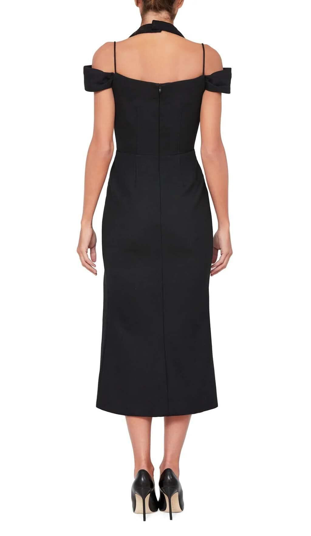 OFF THE SHOULDER HALTER MIDI DRESS IN BLACK