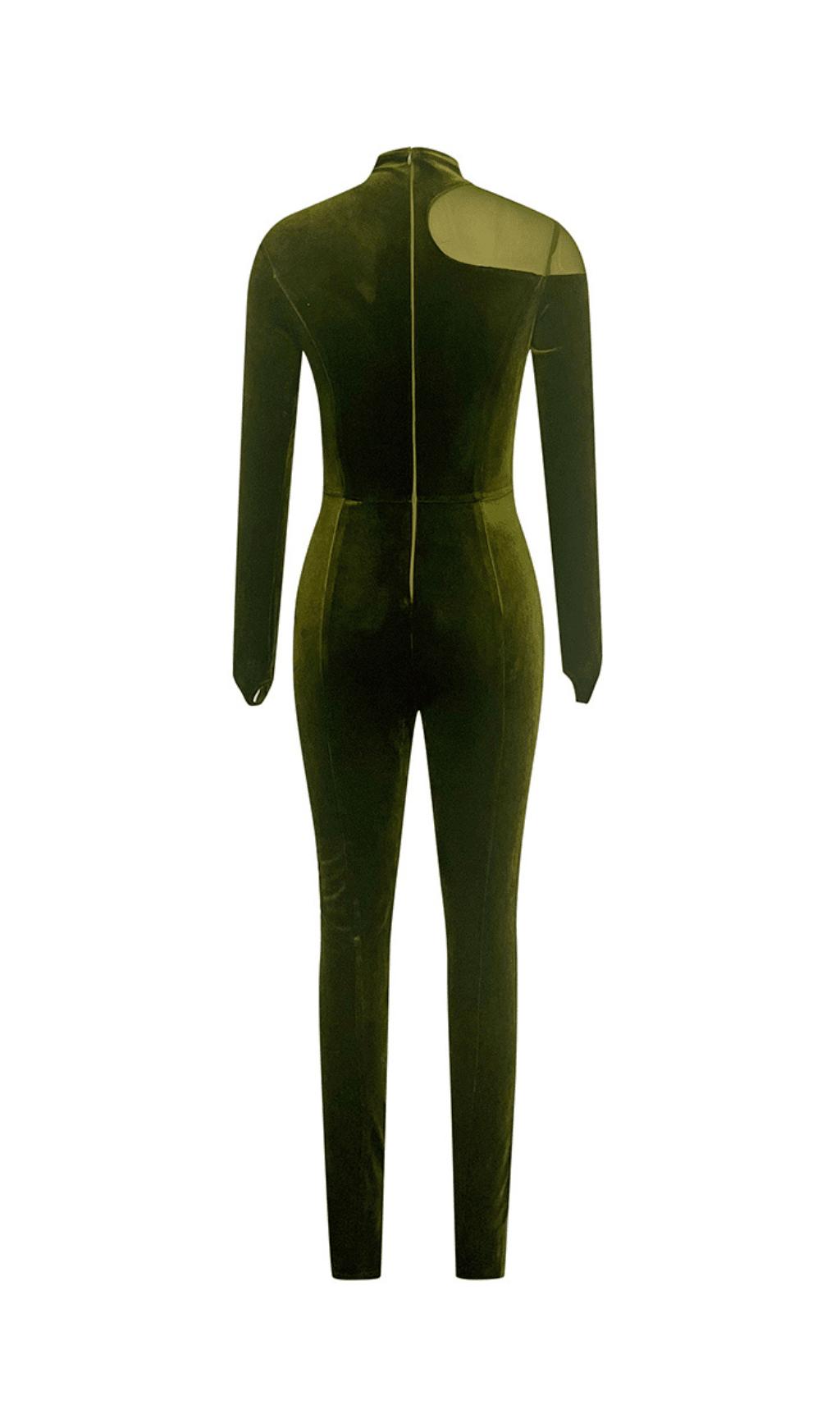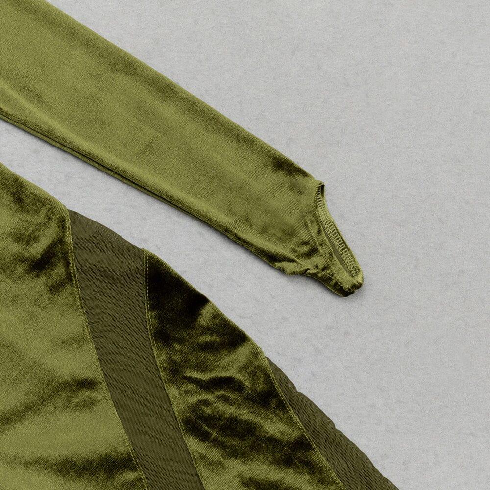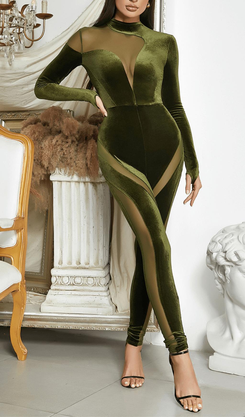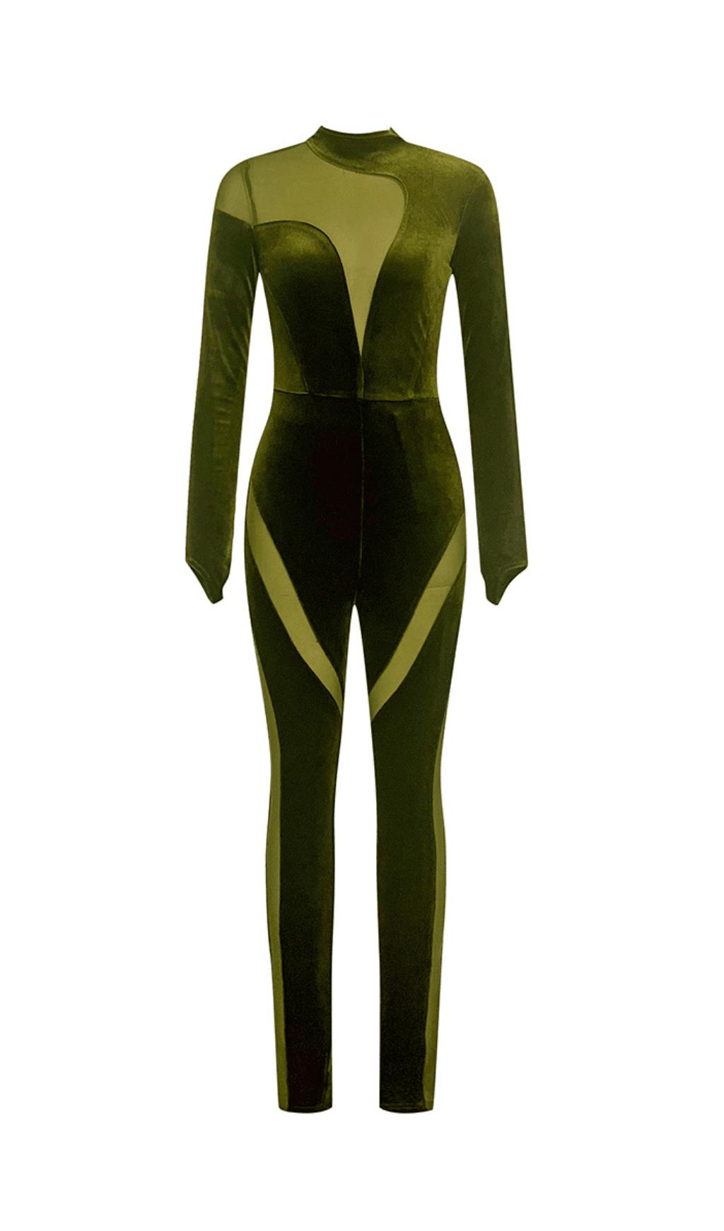 OLIVE GREEN VELVET CASUAL LONG-SLEEVED TIGHT MESH JUMPSUIT