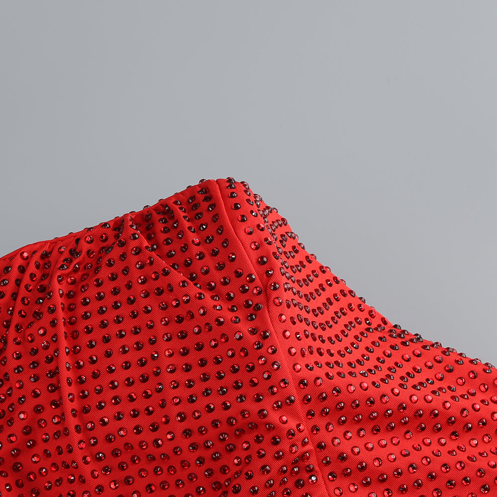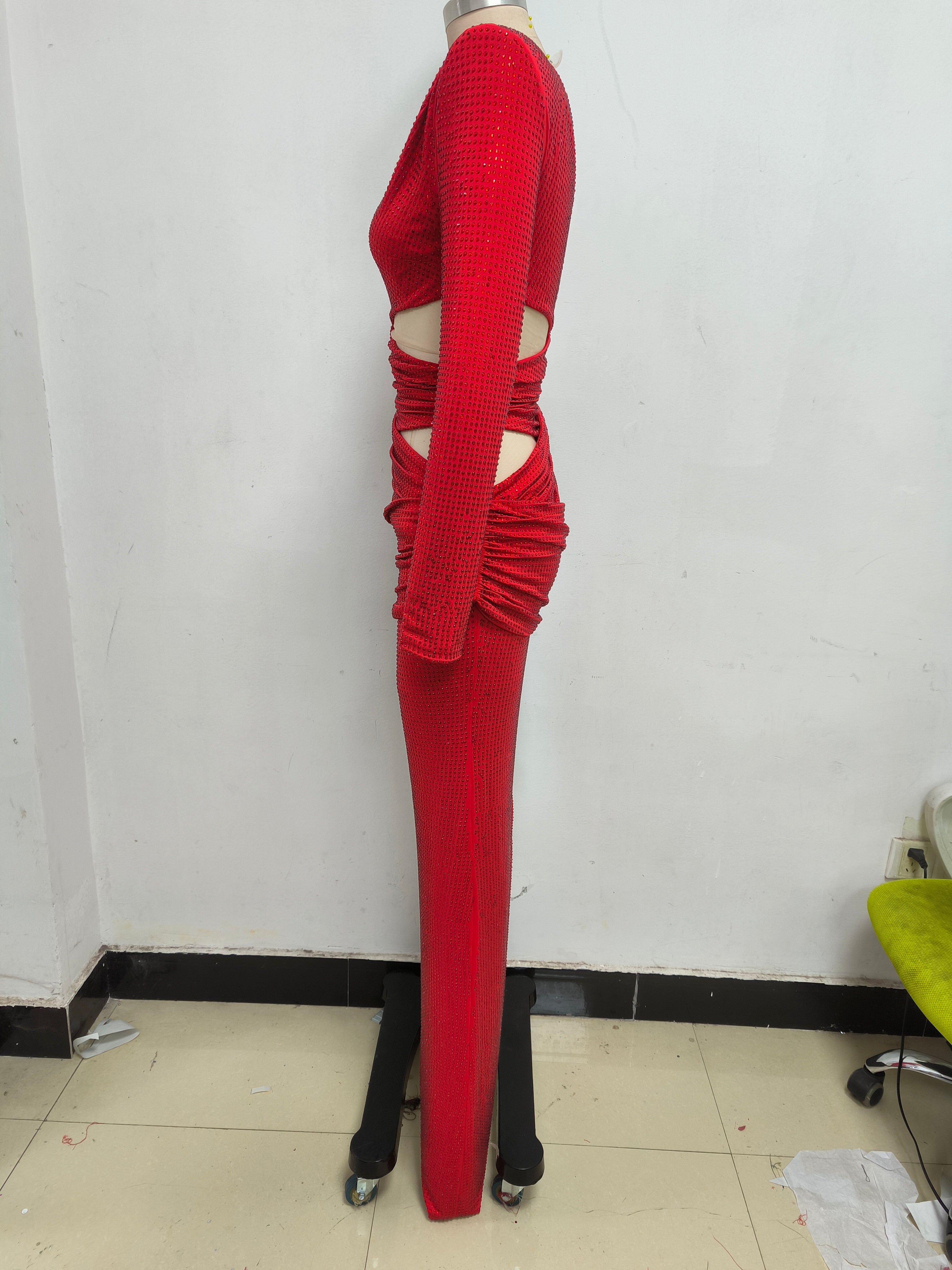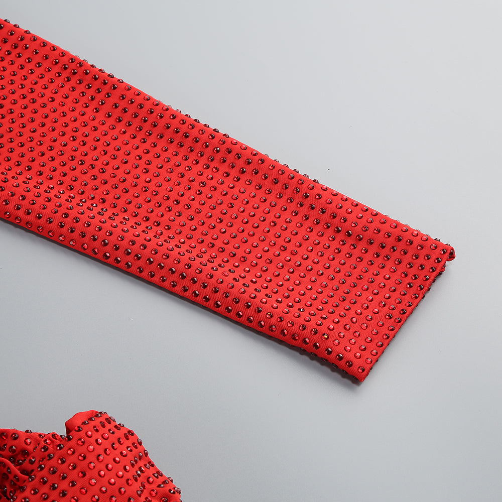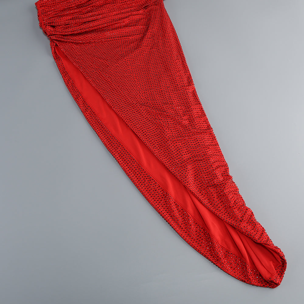 One-shoulder hot diamond hollow irregular slit red maxi dress