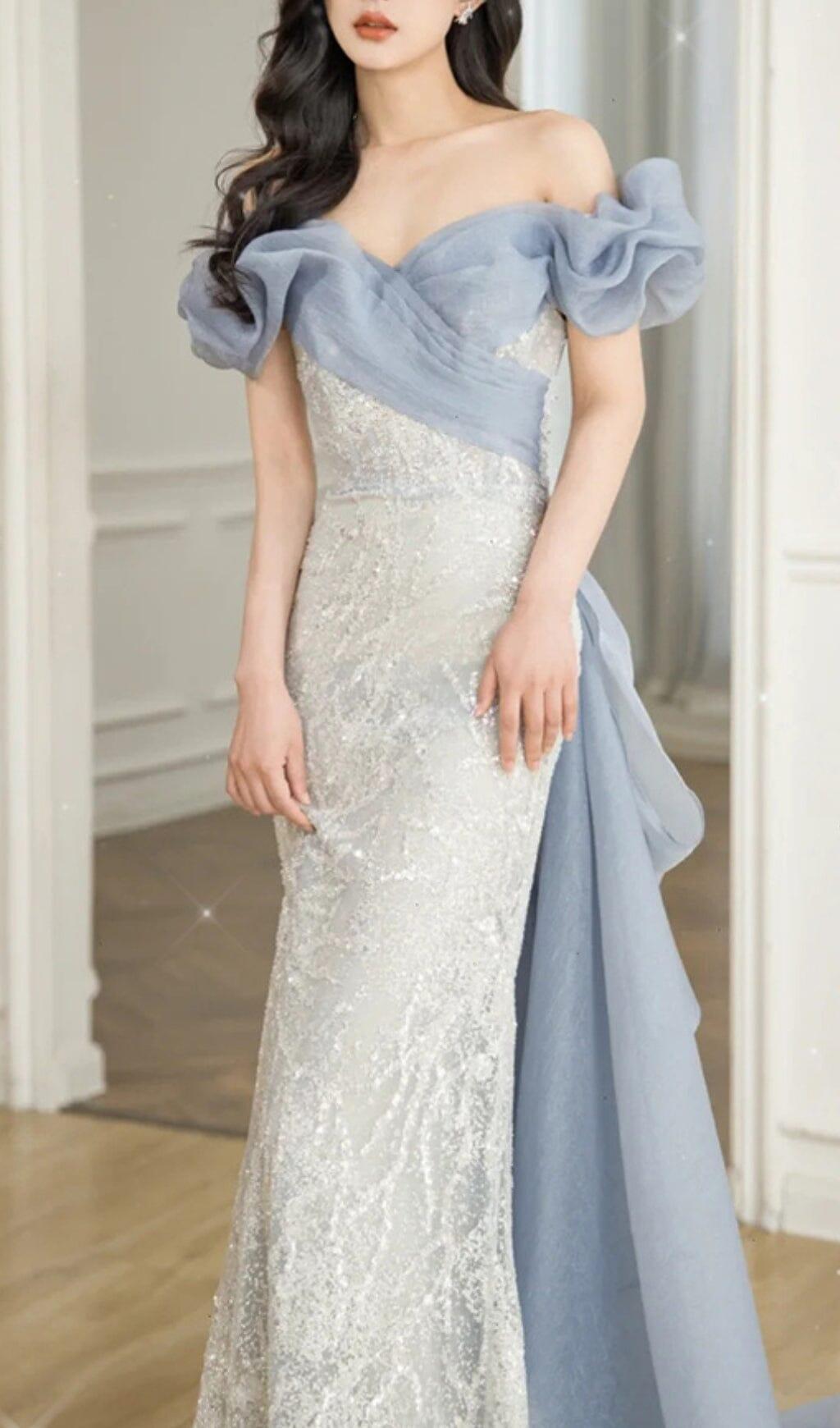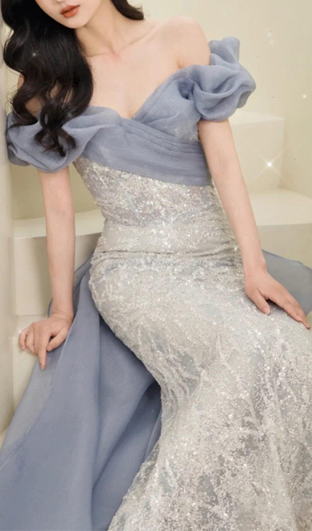 Introducing the Off Shoulder Sequin Stitched Maxi Dress in Silver