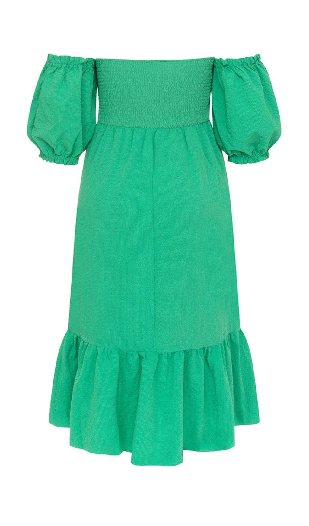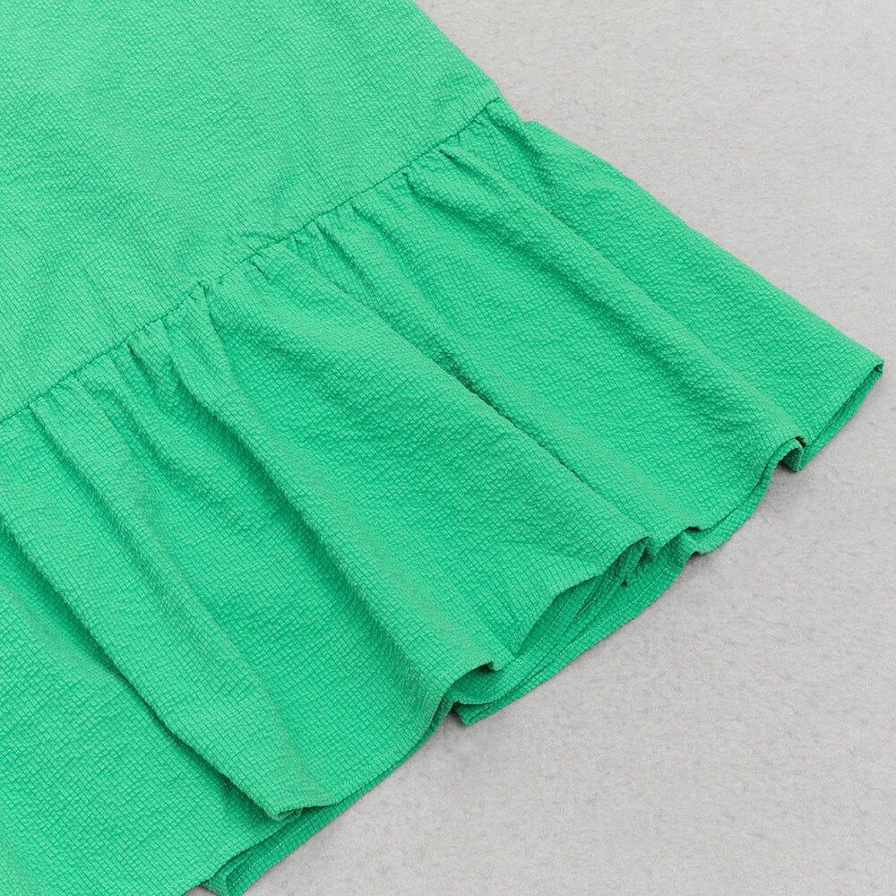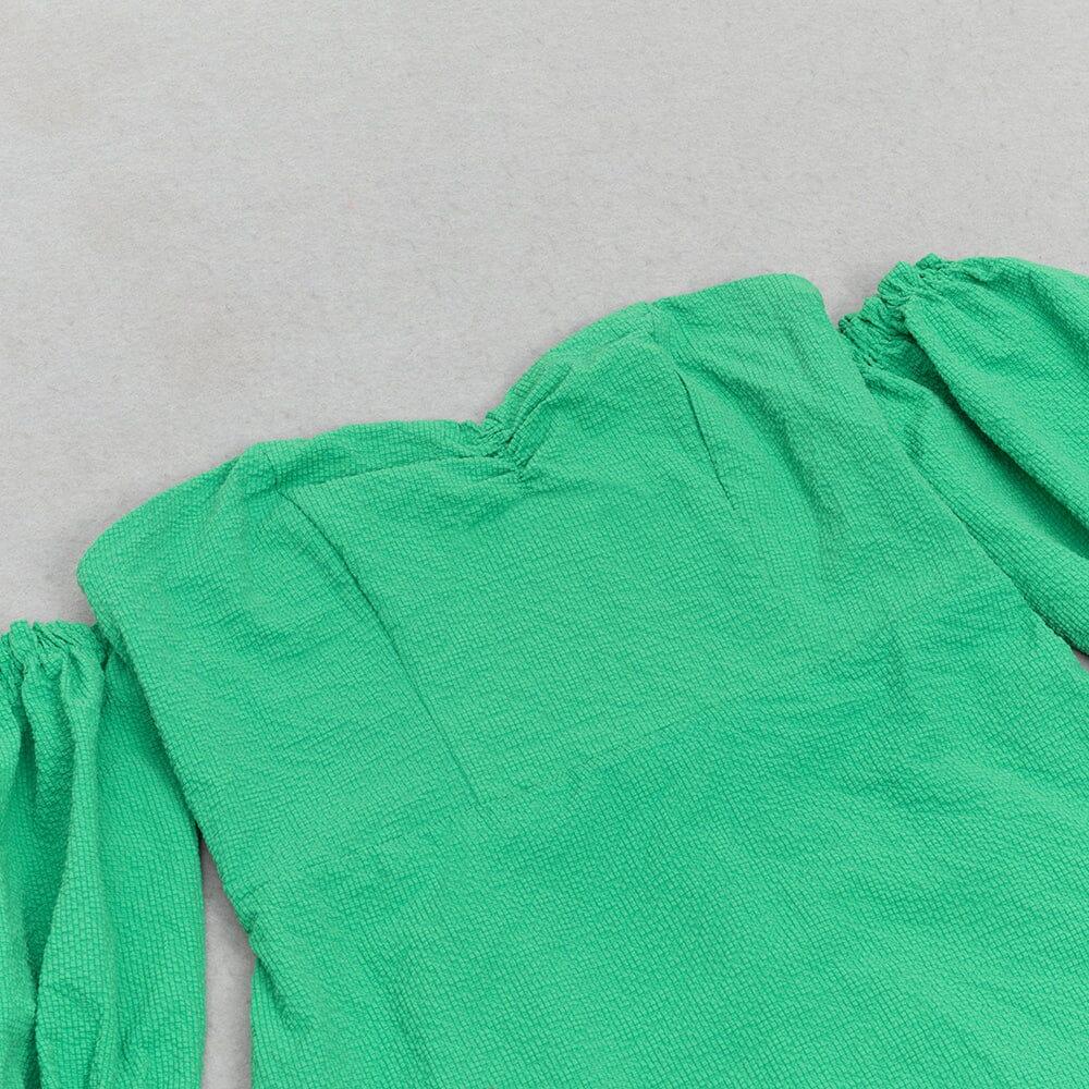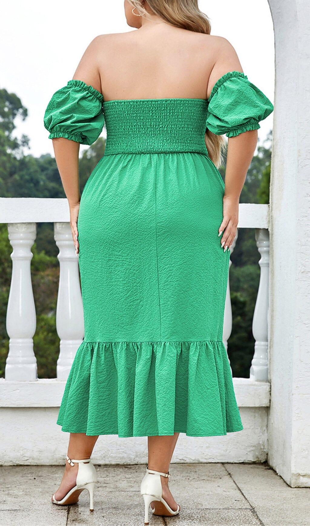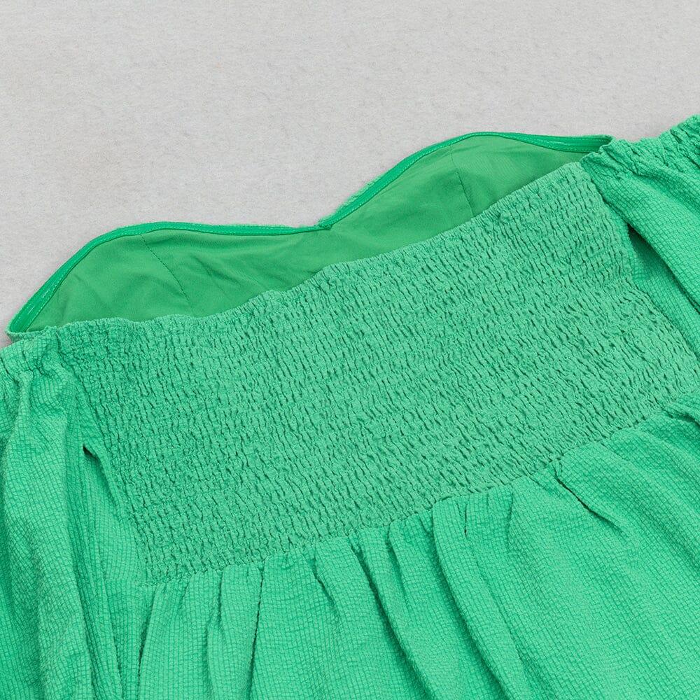 ONE-SHOULDER PUFF-SLEEVED GREEN TUBE TOP RUFFLED MIDI DRESS