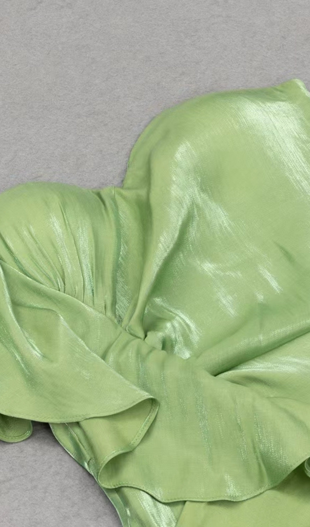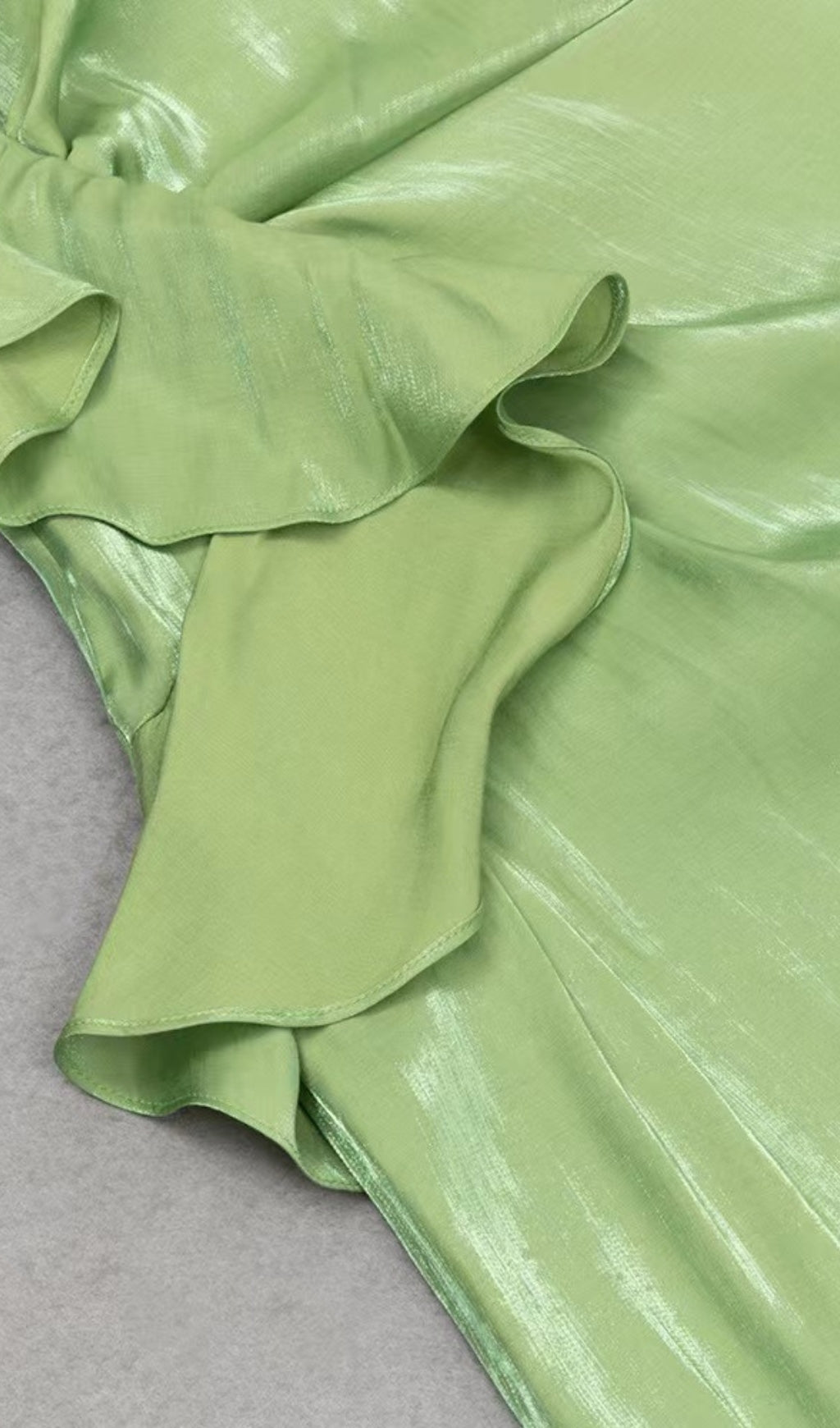 • Details:    Ruched, Split Thigh, Exaggerated Ruffle