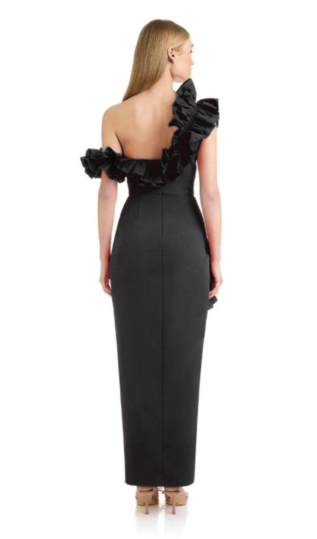 One - Shoulder Ruffle - Trimmed Slit Midi Dress in Black