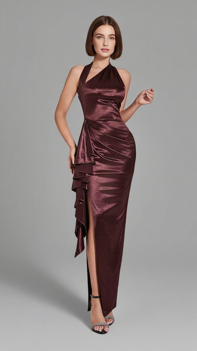 This dress features a burgundy hue, one - shoulder neckline, ruffled detailing, and a side slit. The elegant, flowing design exudes sophistication. Ideal for ��holiday break dress to impress�� gatherings, as ��hoco dress inspo�� for homecoming, or a ��gothic romance outfit dress to impress�� event. Its refined, stylish look lets you ��dress to impress�� confidently, perfect for parties, formal dinners, or special outings to stand out.
