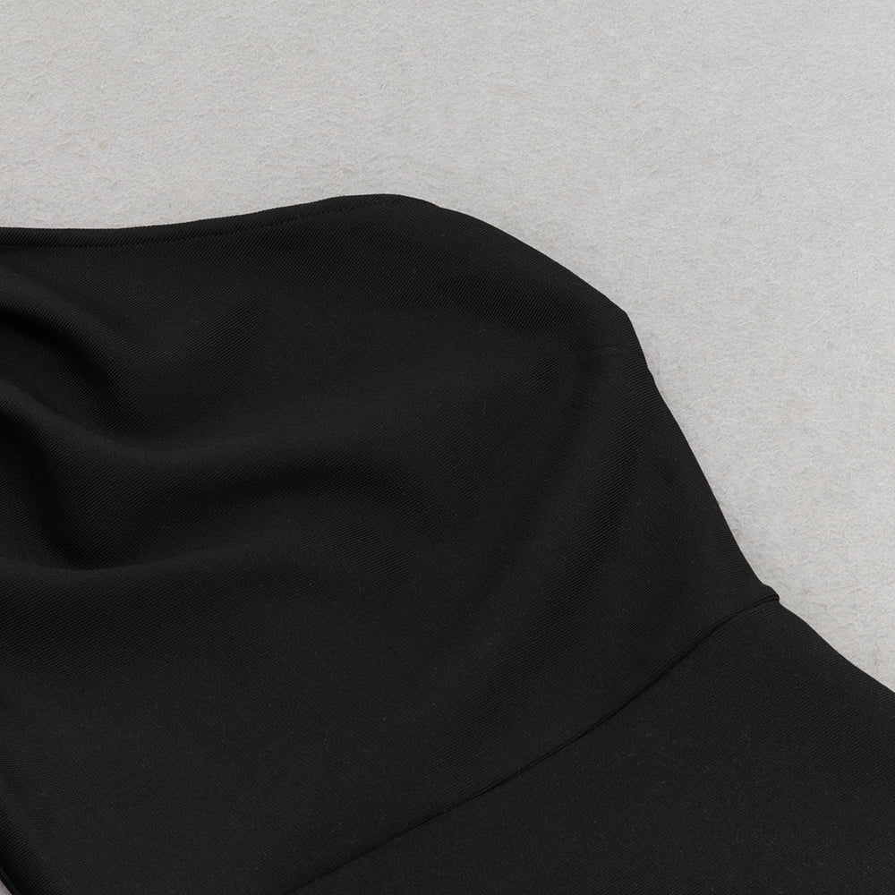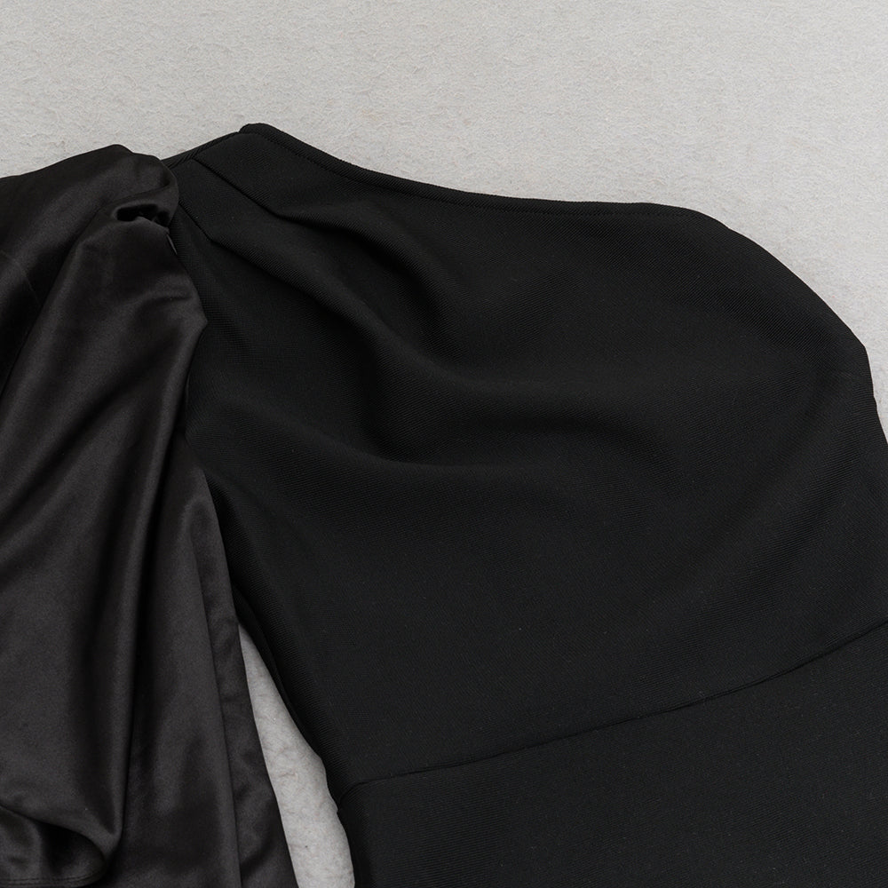 Get ready to turn heads in this one-of-a-kind black satin bodycon midi dress with a playful one-shoulder design. With a sleek body-hugging fit, you'll feel confident and stylish all night long. Perfect for any special occasion, this dress is a must-have for any fashion-forward wardrobe.