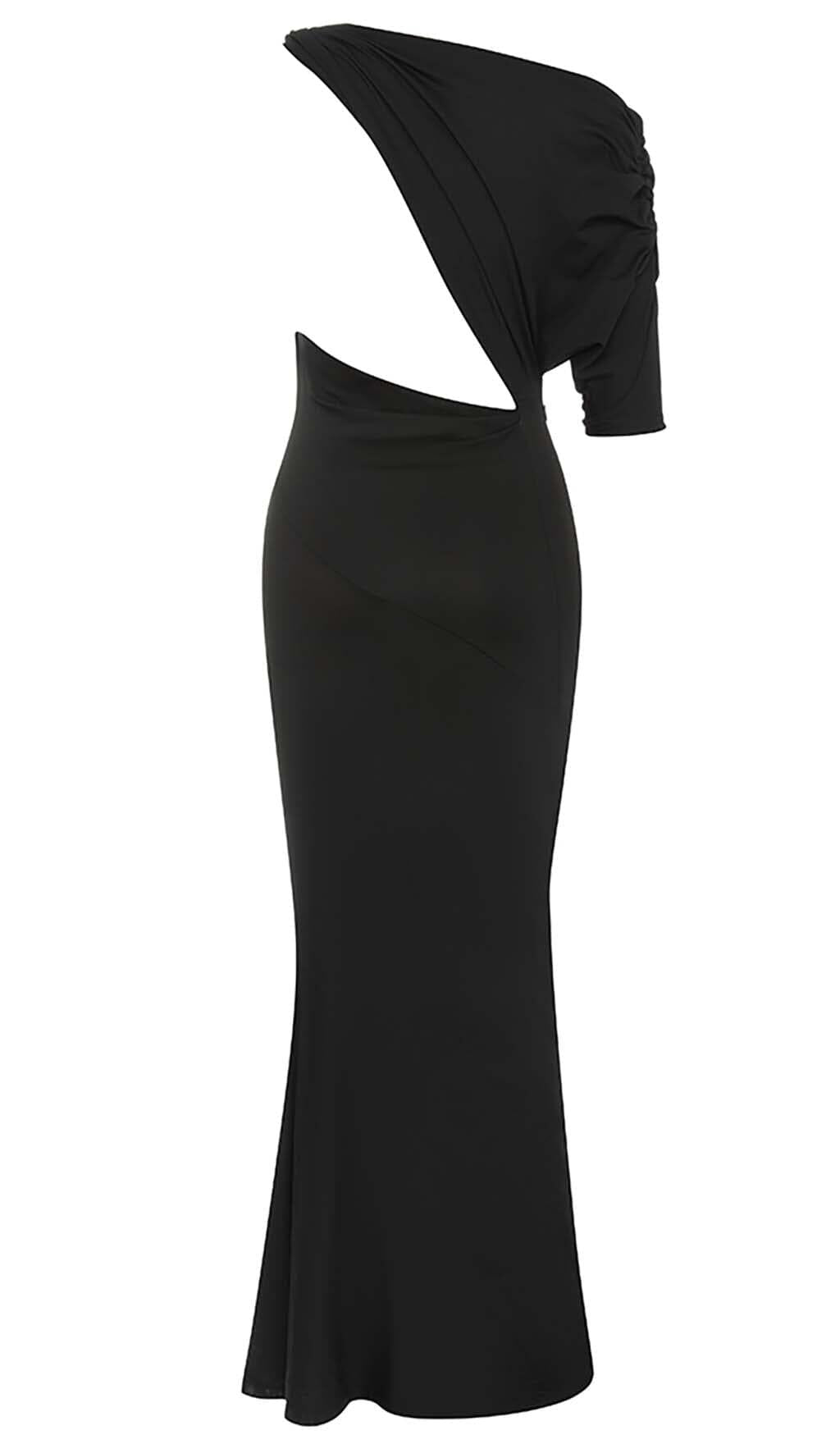 ONE SHOULDER SATIN MAXI DRESS IN BLACK