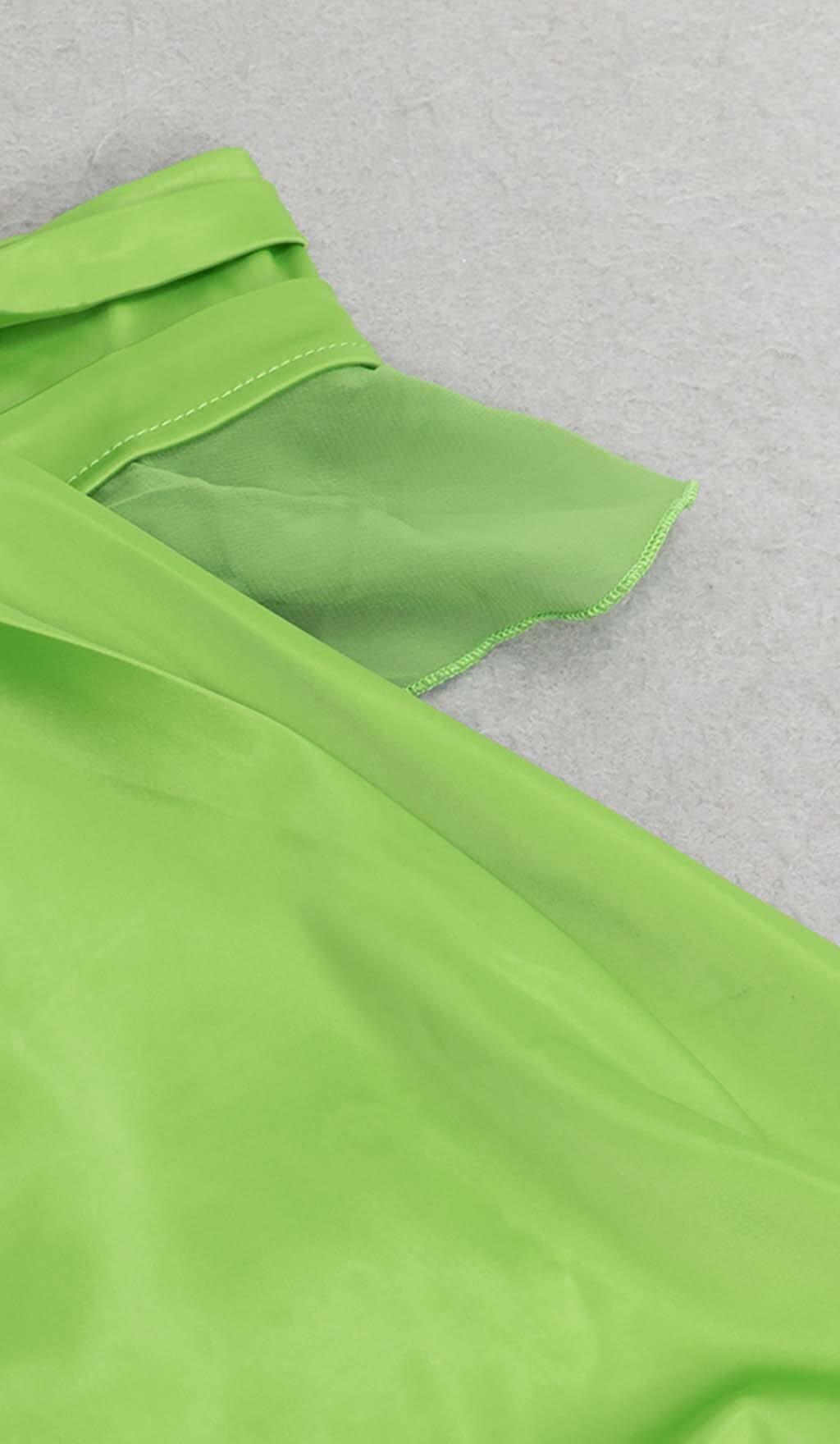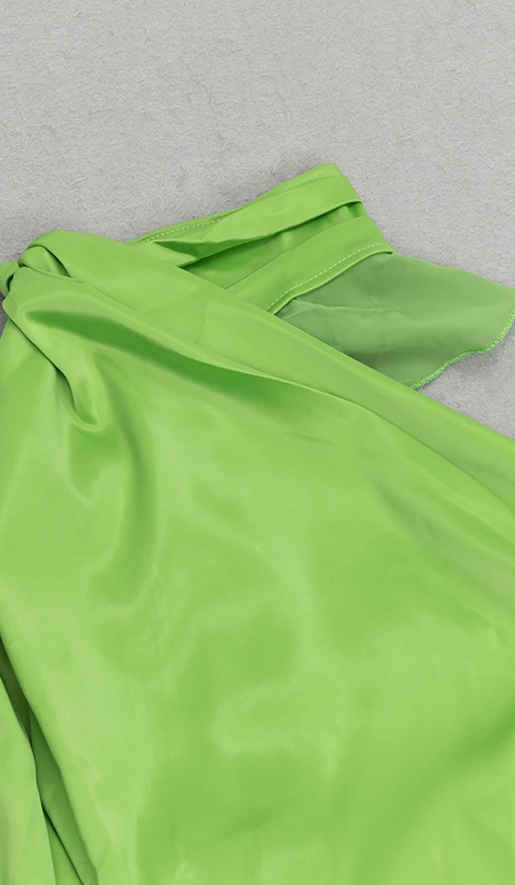 ONE-SHOULDER SATIN RUFFLE MAXI DRESS IN NEON GREEN