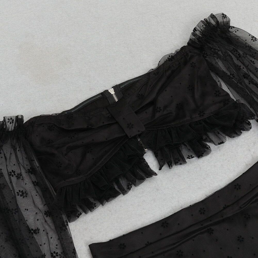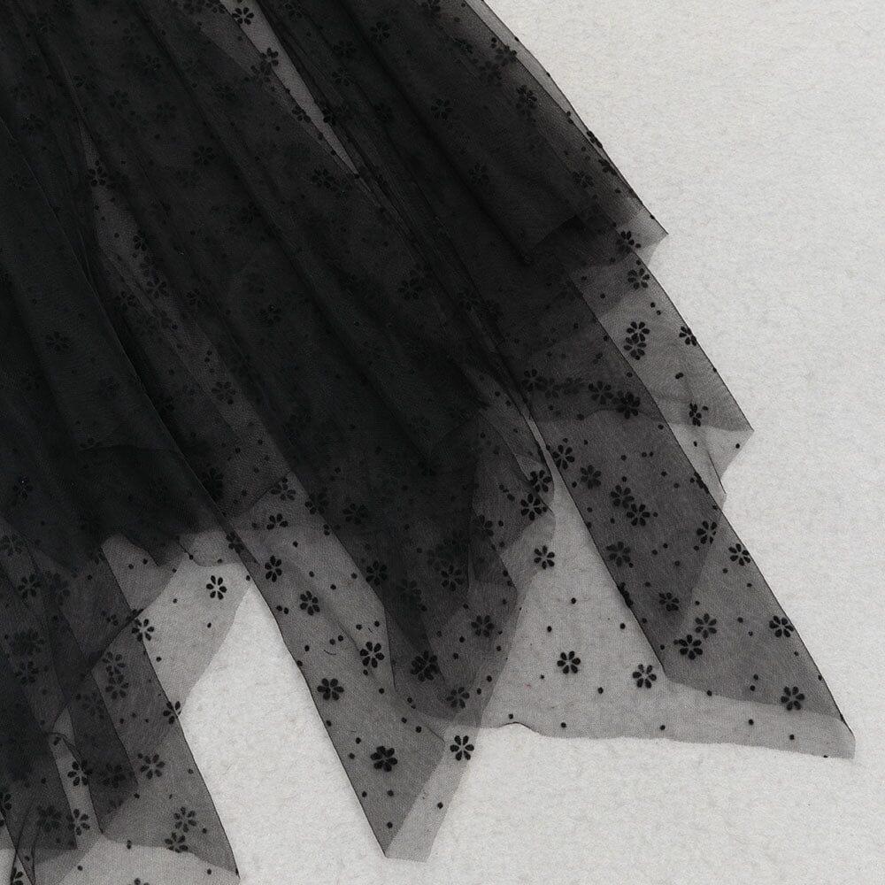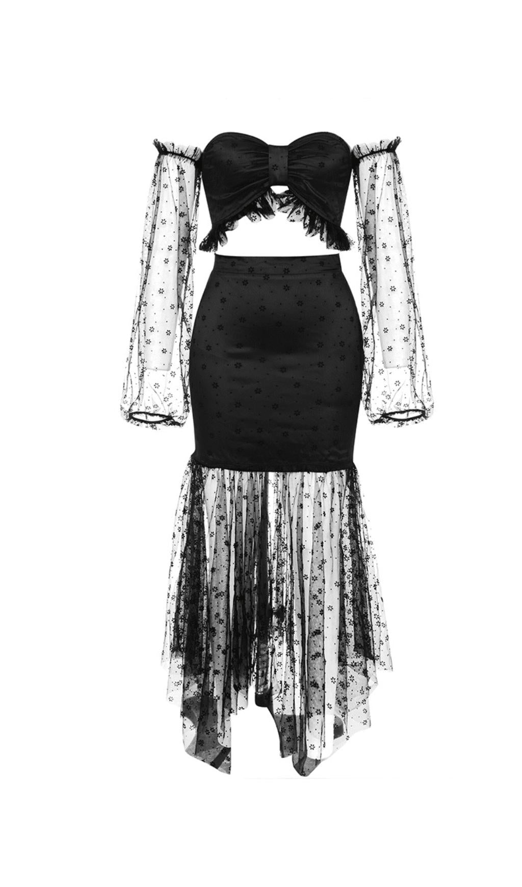 A sheer mesh midi dress featuring an allover star design, pleated construction, tulle lining, and elasticized high waist.