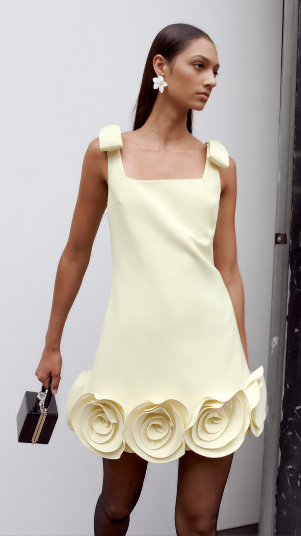 Sculptural floral motifs at the hem add irresistible charm to the minimalist cut of this yellow crepe mini dress. Bow-topped straps are the cherries on top – wear with heels for the next soirée.