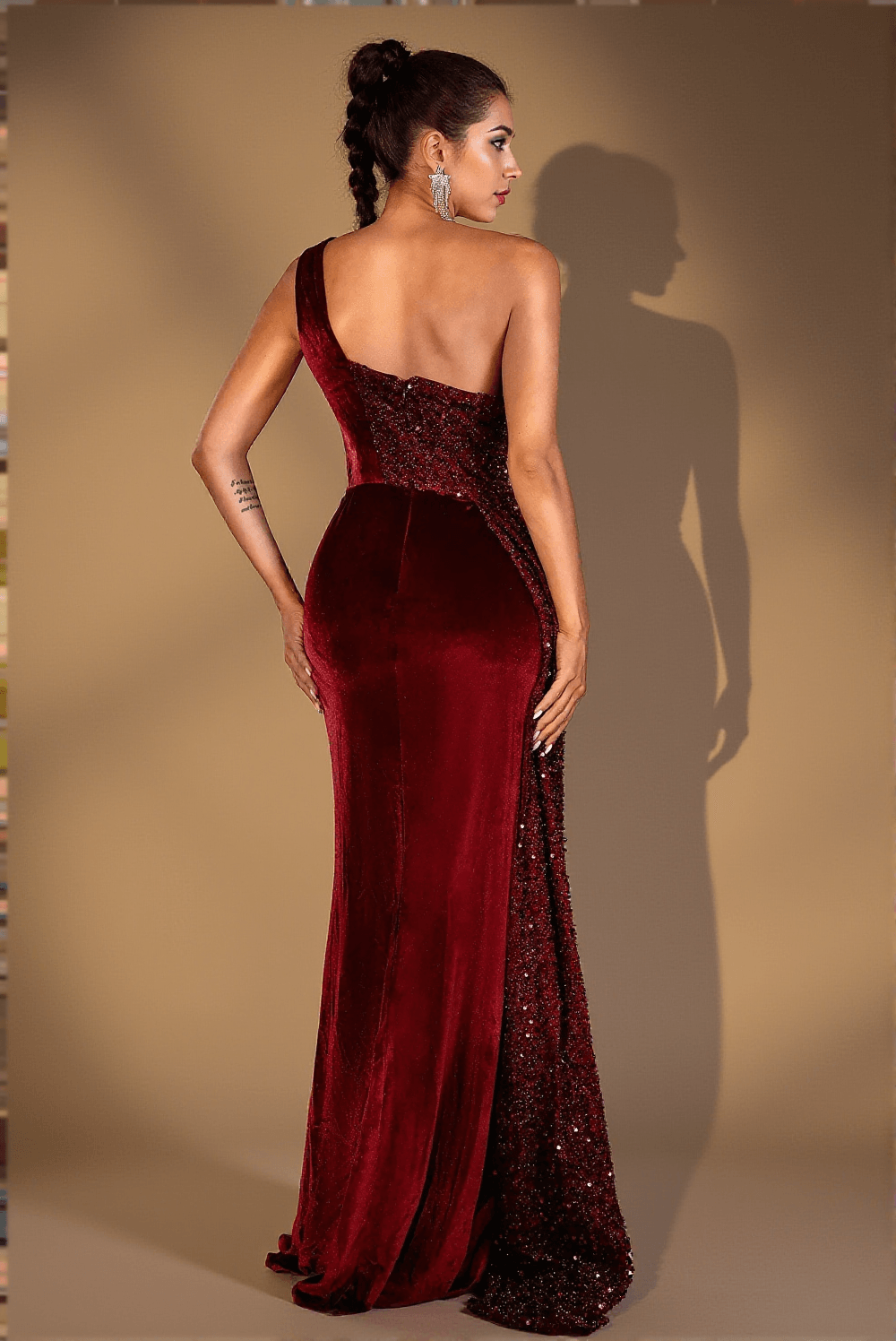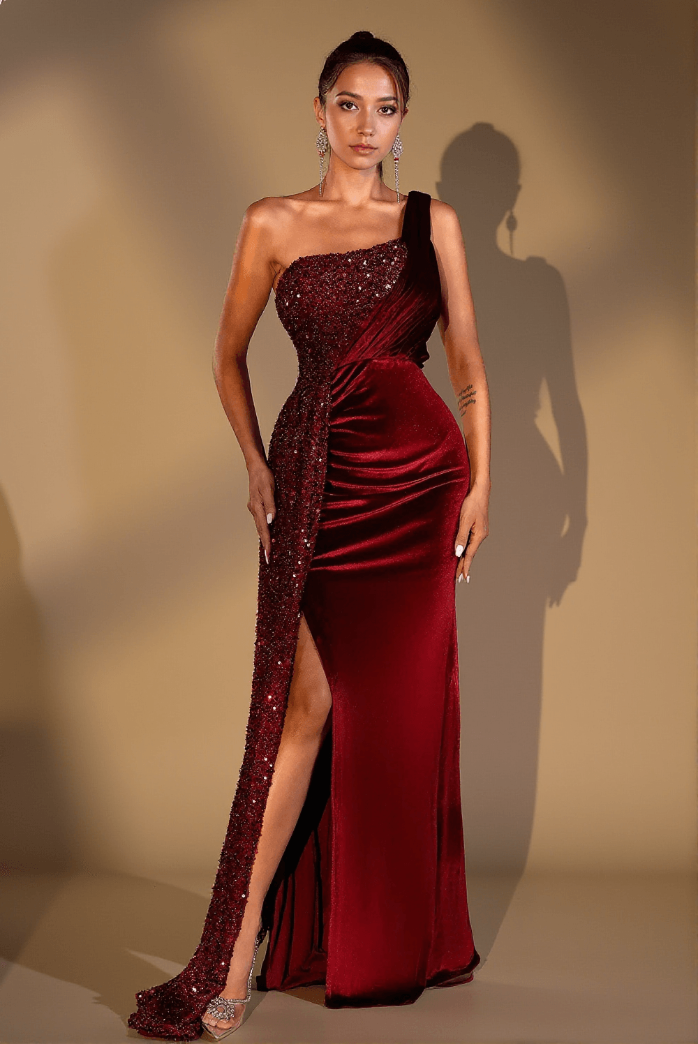 Elevate your fashion game with our exquisite Velvet One-Shoulder Pleated High-Slit Sequin Maxi Dress. Designed to embody elegance and sophistication, this dress features a luxurious velvet fabric that glides over the body, complemented by an elegant one-shoulder silhouette.