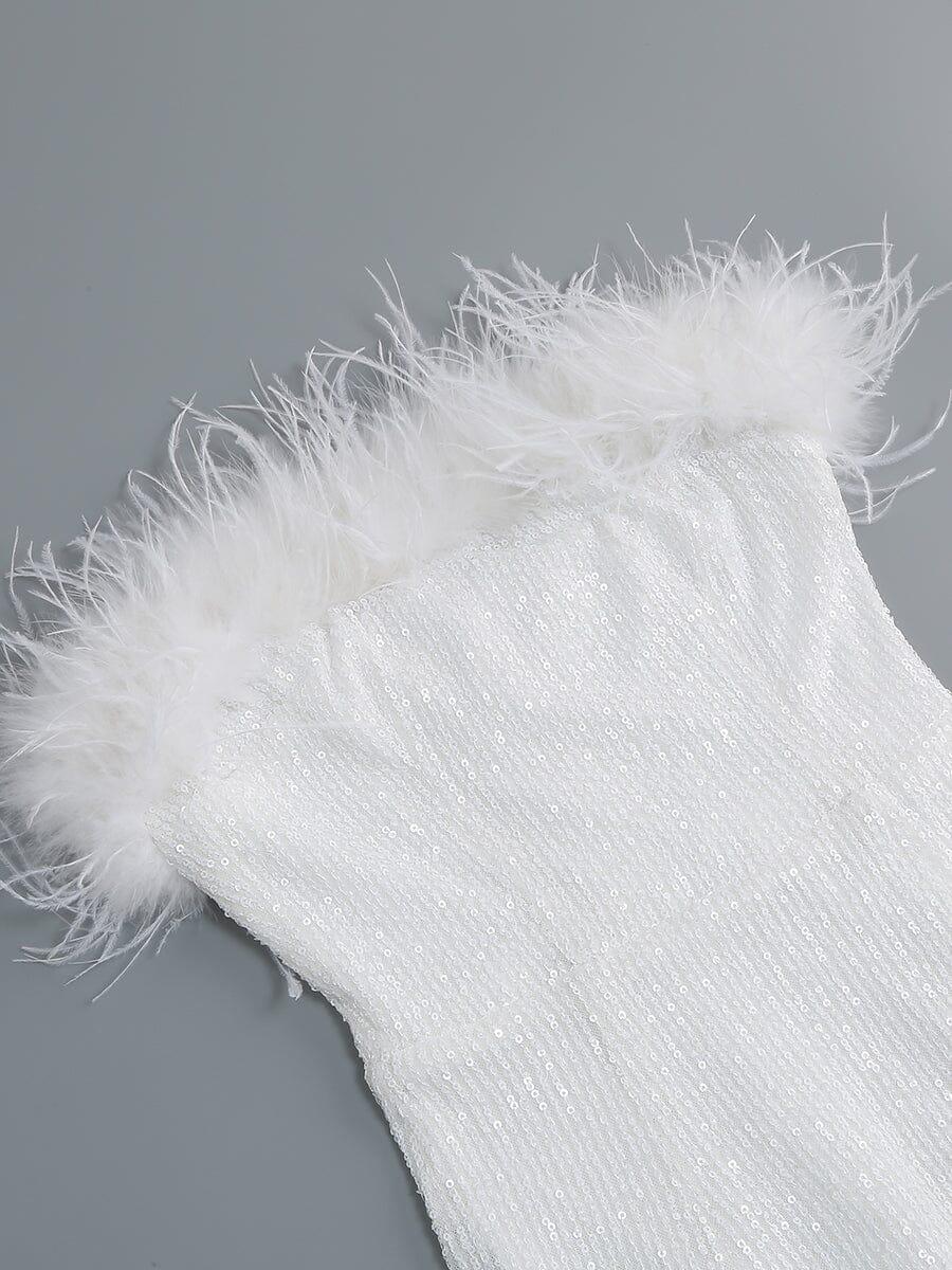 Elevate your style and make a statement with our Ostrich Hair Decorative Bandeau Maxi Dress in White. This dress is perfect for special occasions, parties, or any event where you want to stand out and showcase your unique sense of style. Choose elegance, choose playfulness, choose this dress.